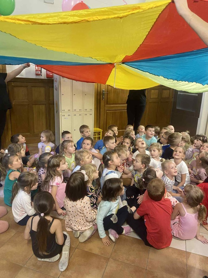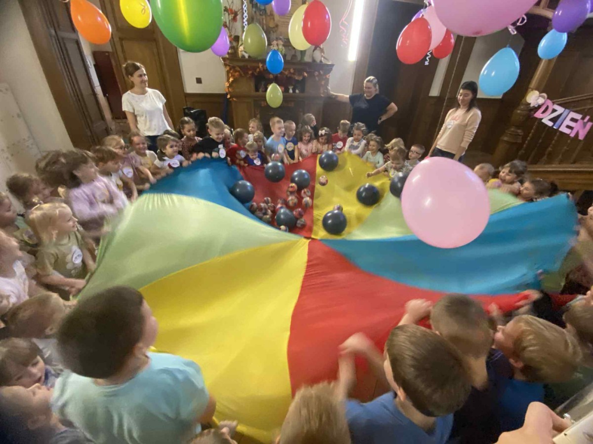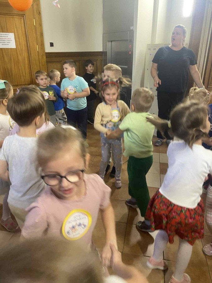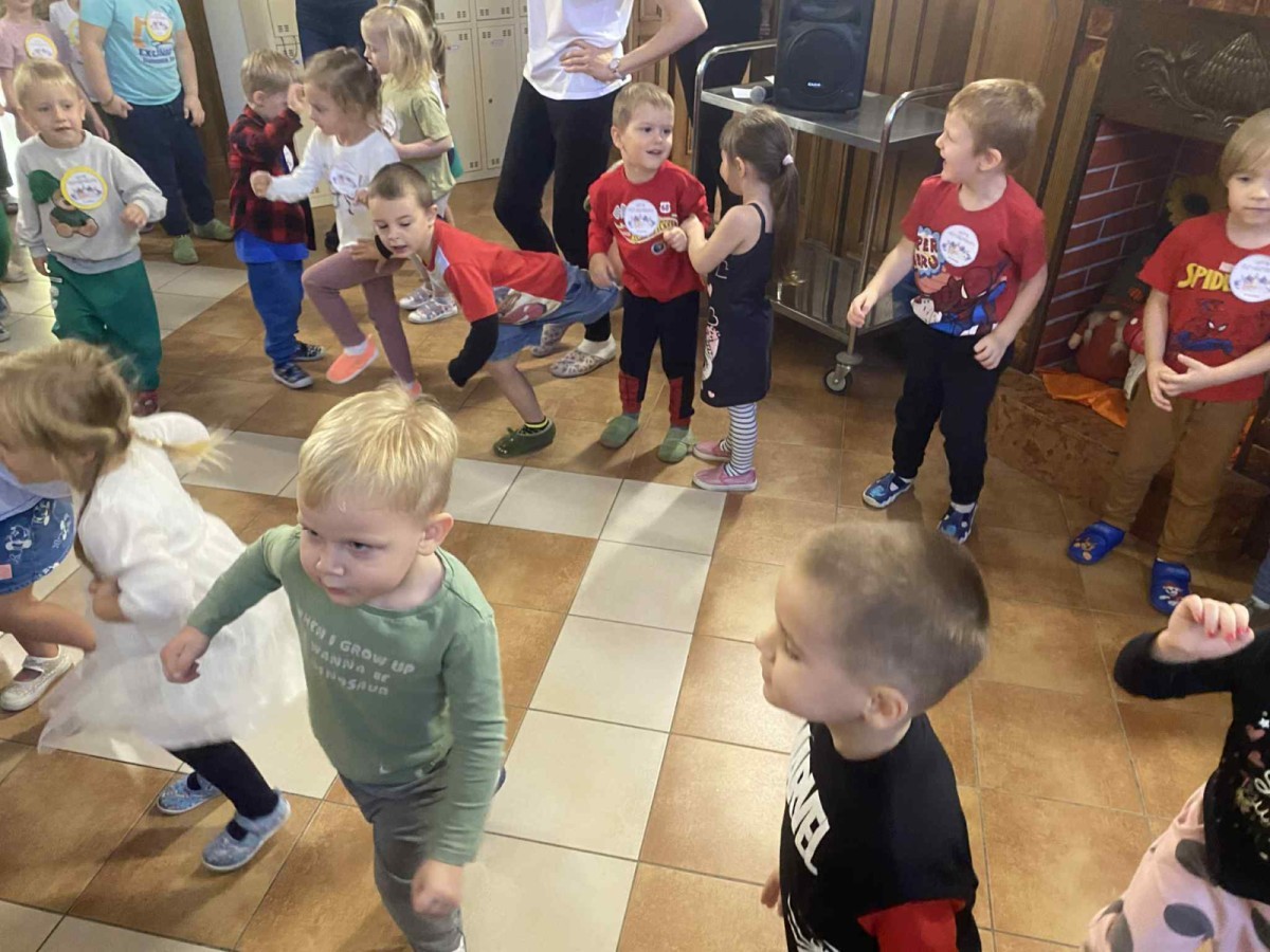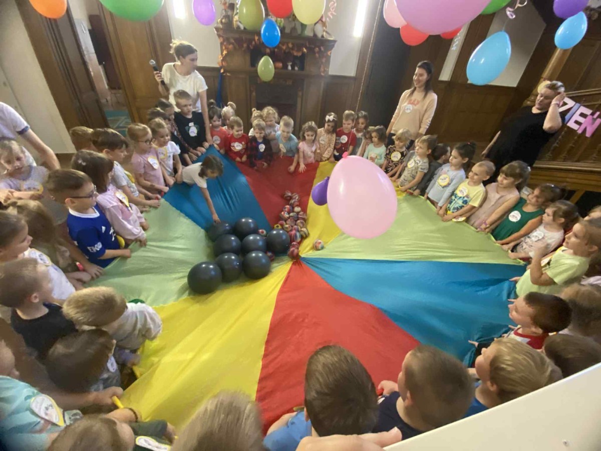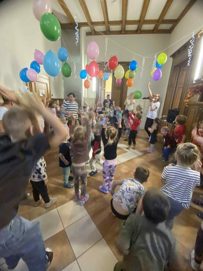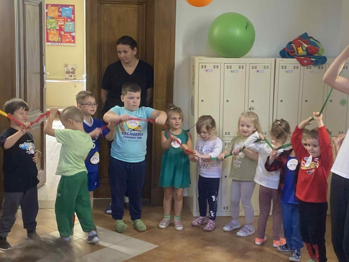 Przedszkolaki uczestniczyły w zabawach ruchowych przy muzyce, tańczyły, śpiewały i brały udział w różnych konkurencjach, które wywoływały mnóstwo uśmiechu i radości. Nie zabrakło również zabawy z chustą animacyjną, kolorowymi piłkami oraz zabaw z gumą, które dostarczyły wszystkim wiele śmiechu i pozytywnej energii.