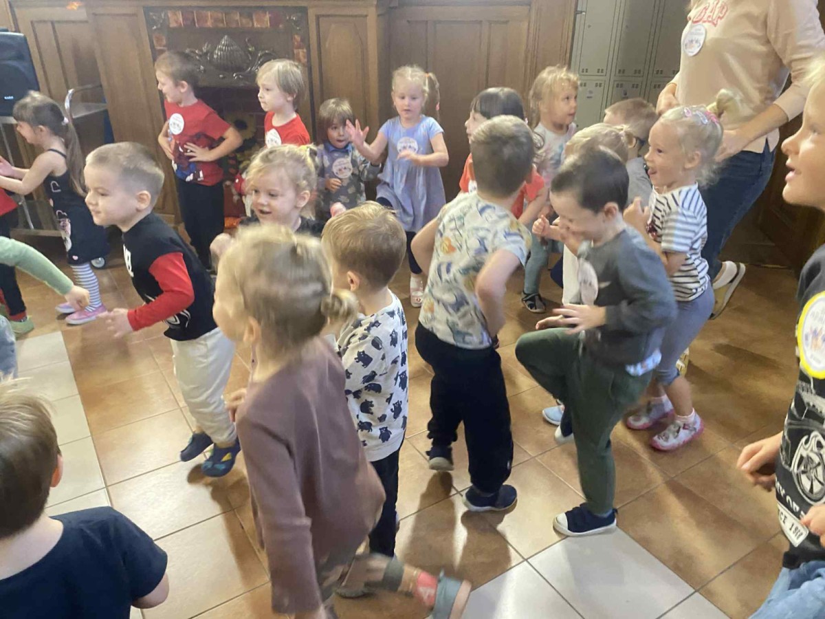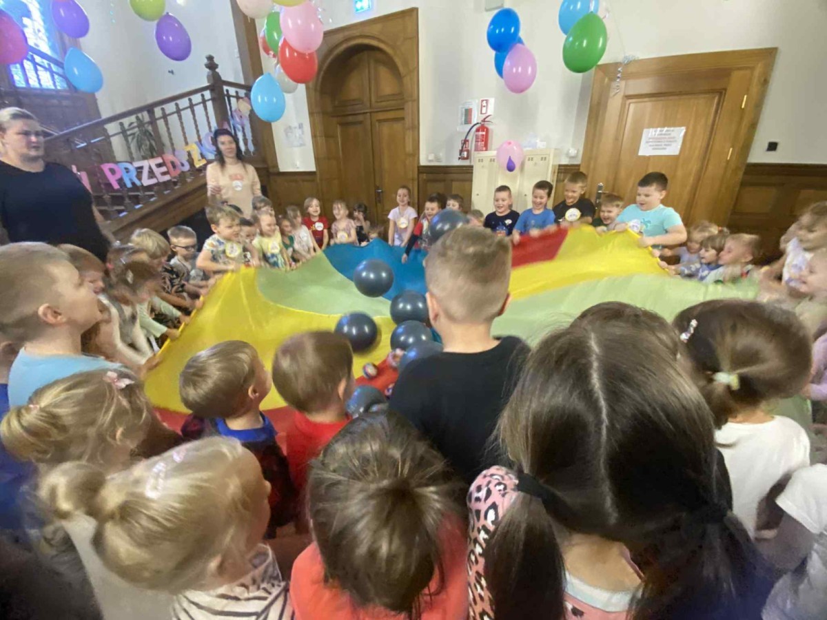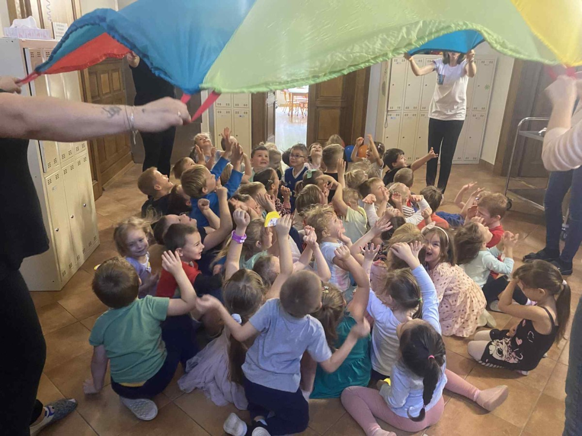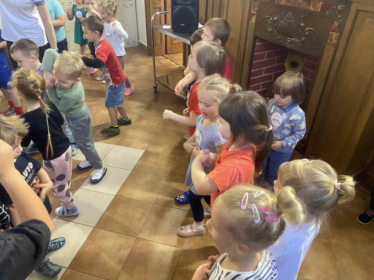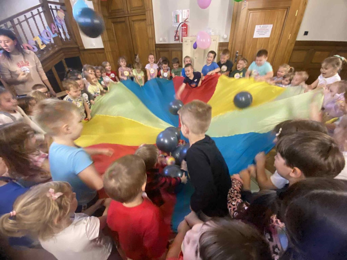 Przedszkolaki uczestniczyły w zabawach ruchowych przy muzyce, tańczyły, śpiewały i brały udział w różnych konkurencjach, które wywoływały mnóstwo uśmiechu i radości. Nie zabrakło również zabawy z chustą animacyjną, kolorowymi piłkami oraz zabaw z gumą, które dostarczyły wszystkim wiele śmiechu i pozytywnej energii.