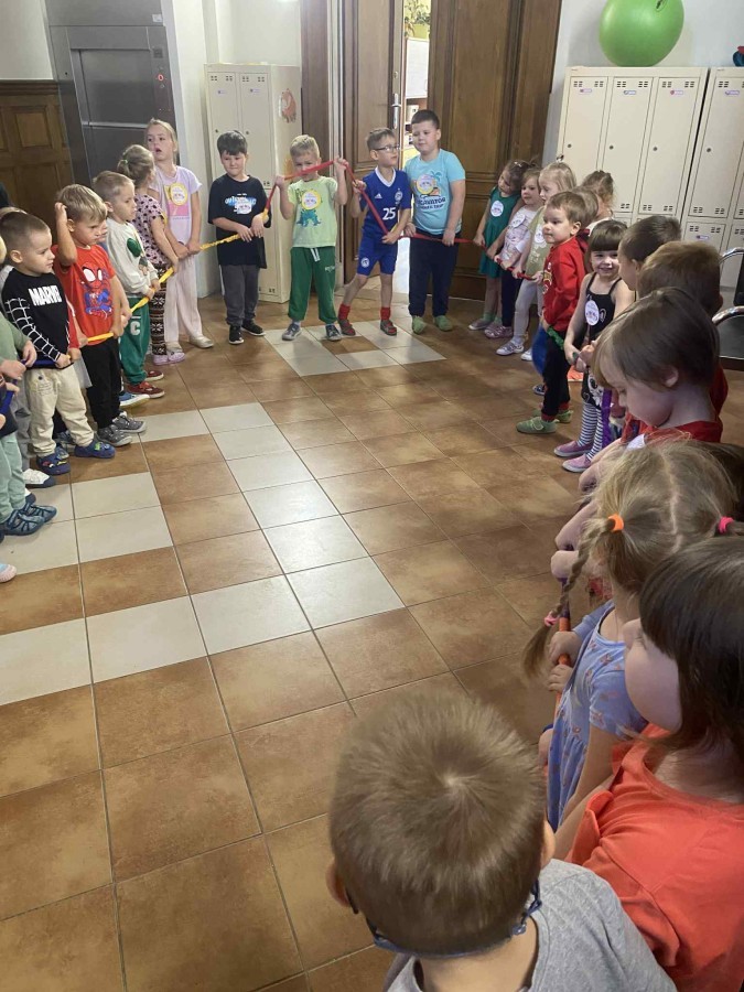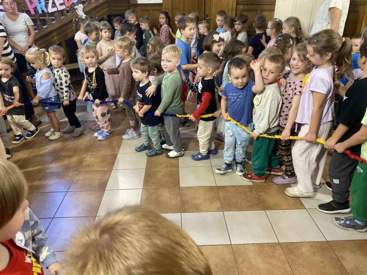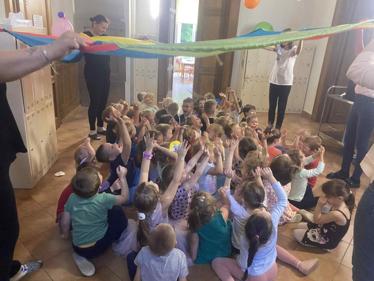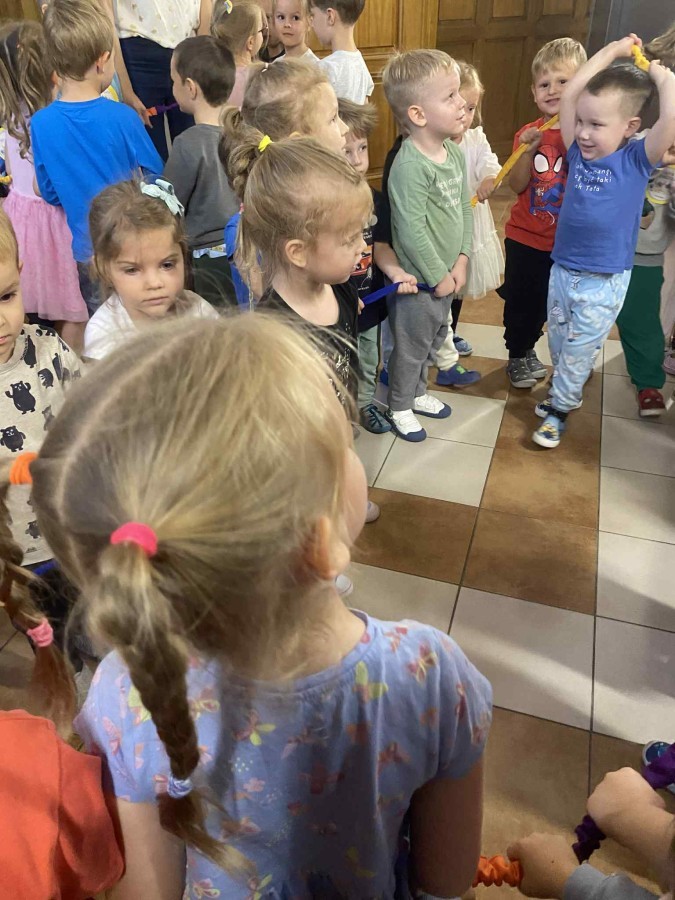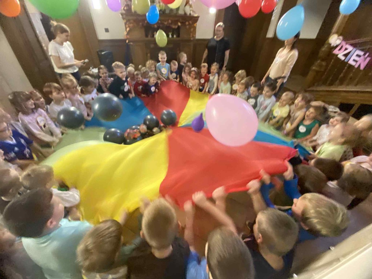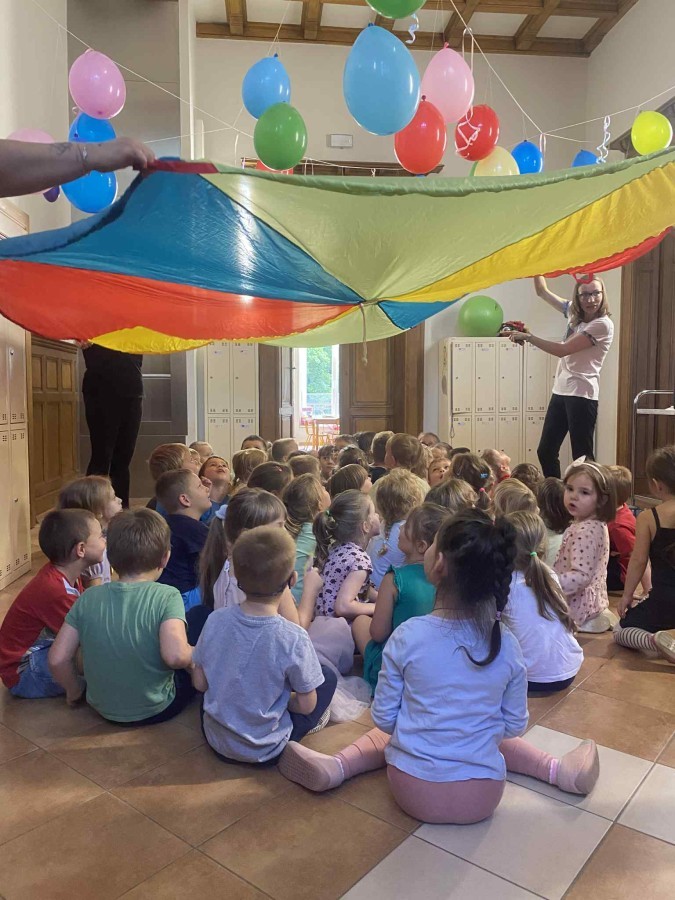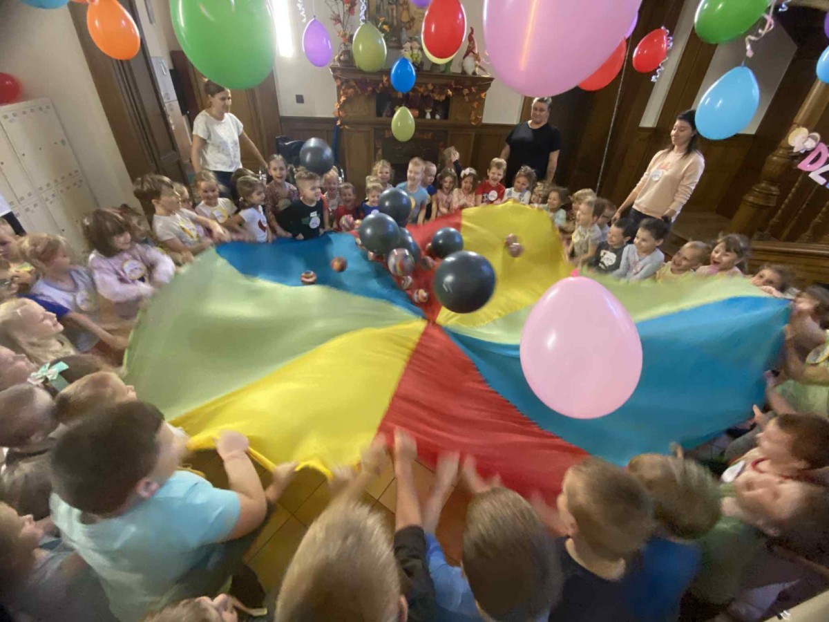 Przedszkolaki uczestniczyły w zabawach ruchowych przy muzyce, tańczyły, śpiewały i brały udział w różnych konkurencjach, które wywoływały mnóstwo uśmiechu i radości. Nie zabrakło również zabawy z chustą animacyjną, kolorowymi piłkami oraz zabaw z gumą, które dostarczyły wszystkim wiele śmiechu i pozytywnej energii.