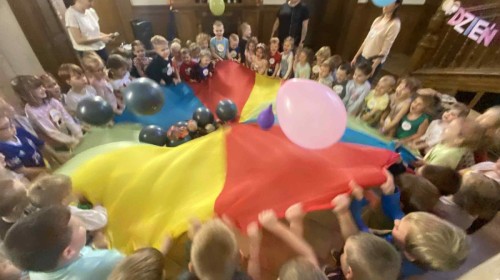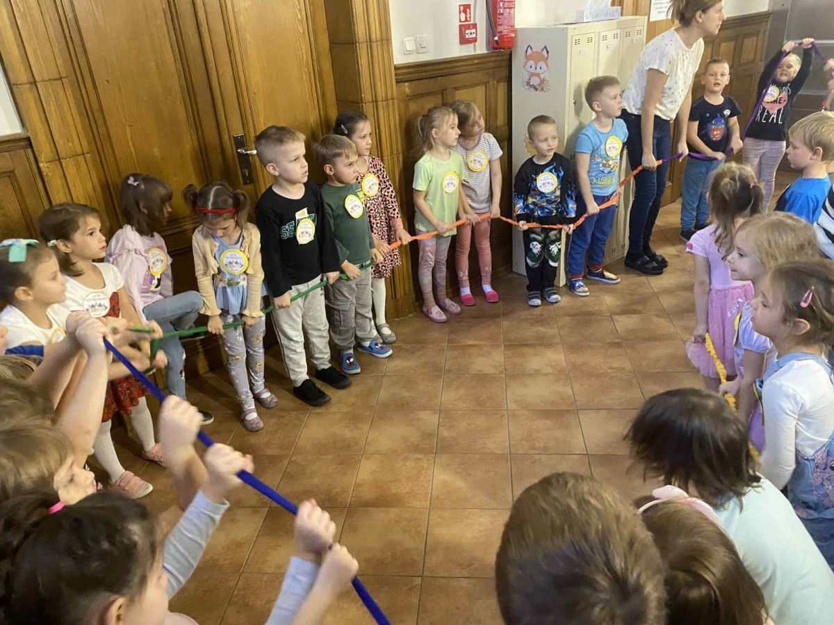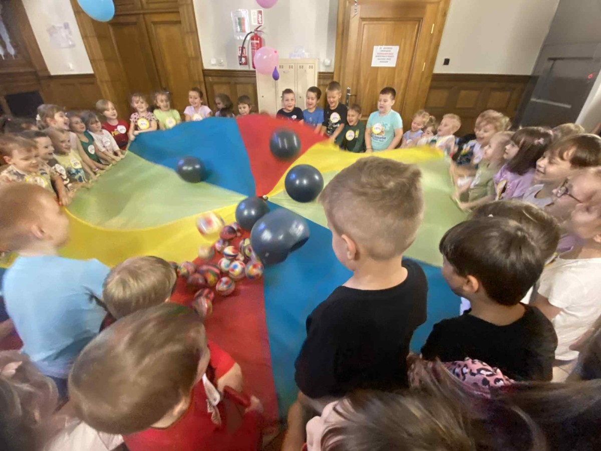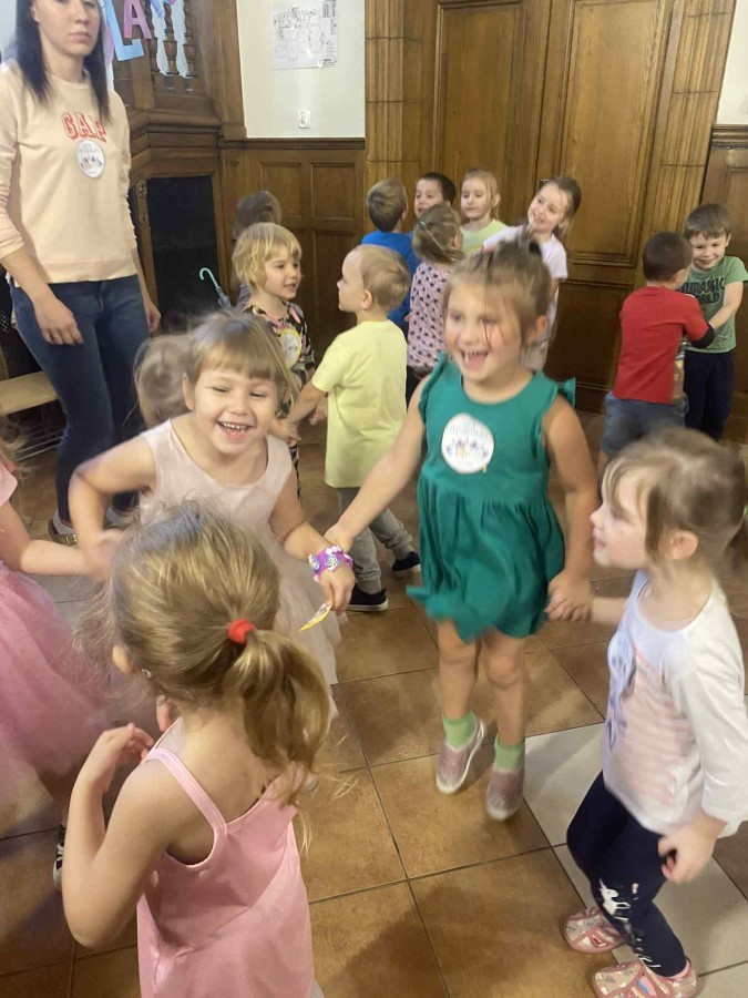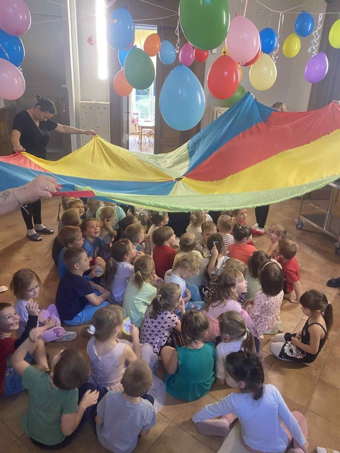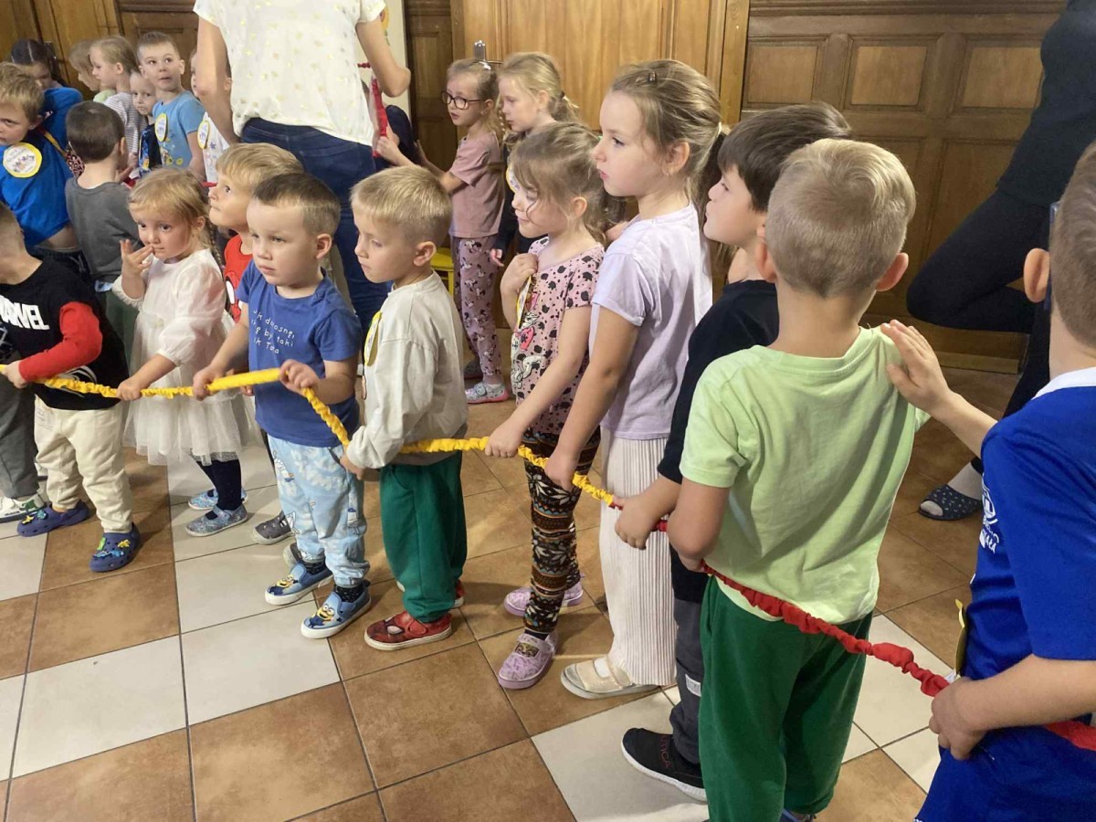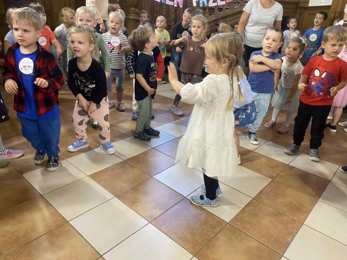 Przedszkolaki uczestniczyły w zabawach ruchowych przy muzyce, tańczyły, śpiewały i brały udział w różnych konkurencjach, które wywoływały mnóstwo uśmiechu i radości. Nie zabrakło również zabawy z chustą animacyjną, kolorowymi piłkami oraz zabaw z gumą, które dostarczyły wszystkim wiele śmiechu i pozytywnej energii.