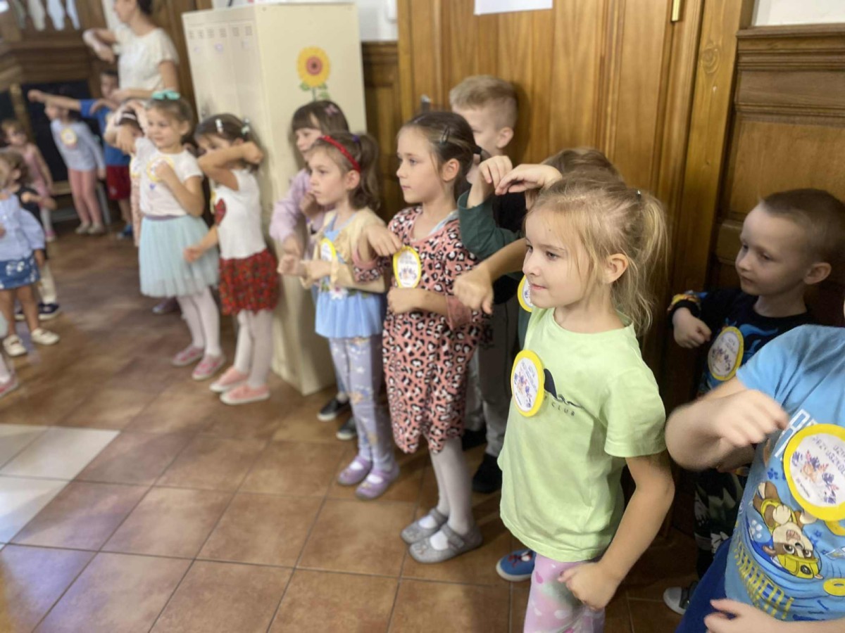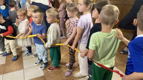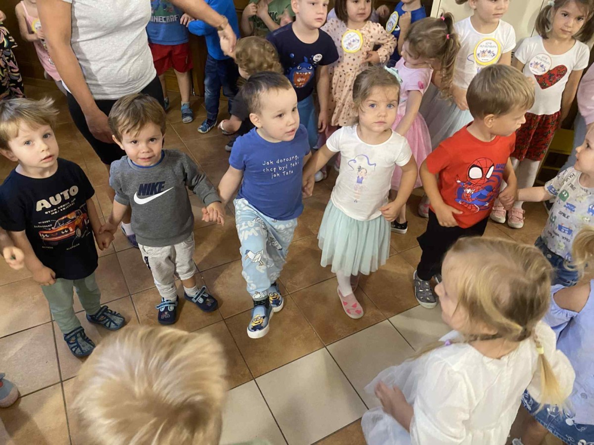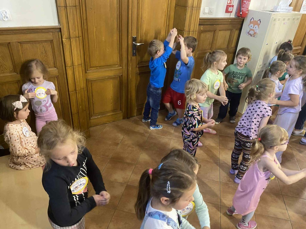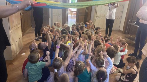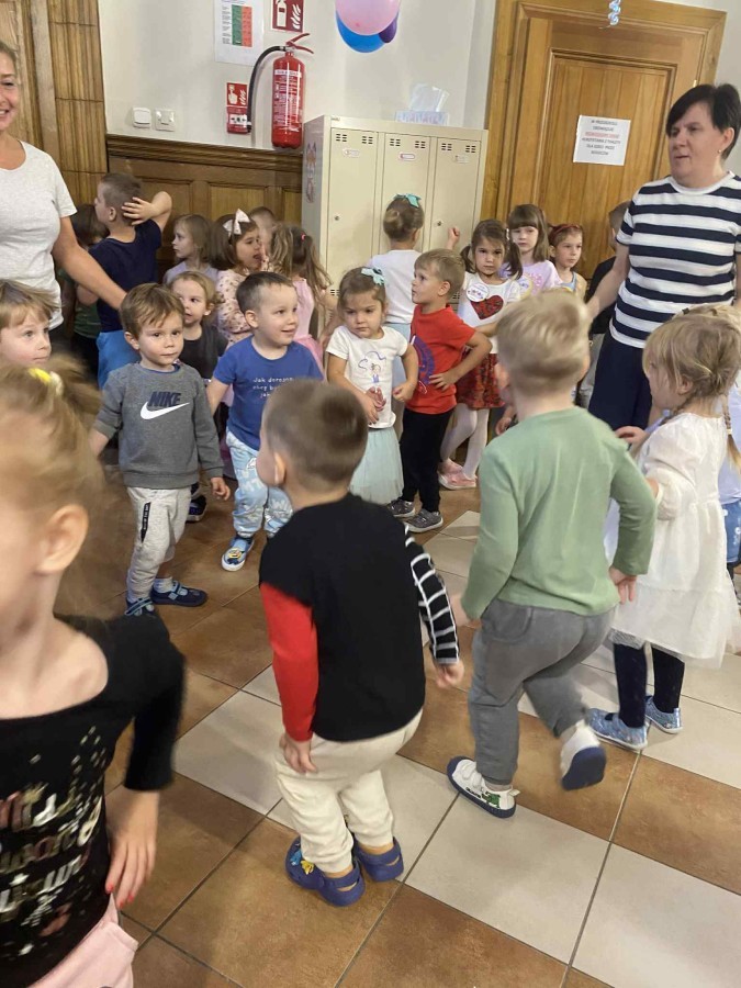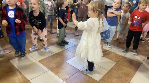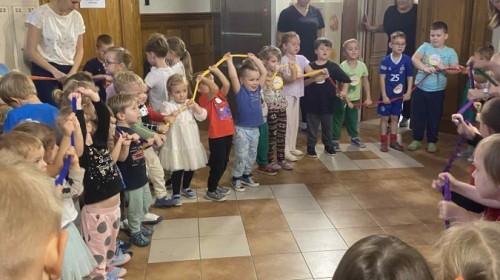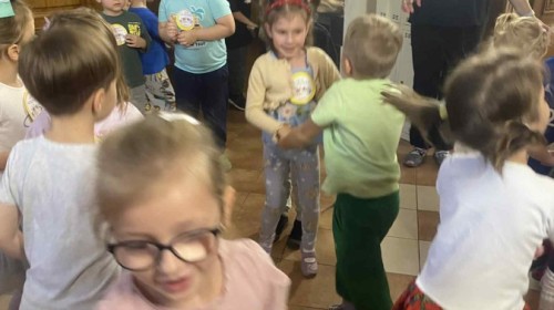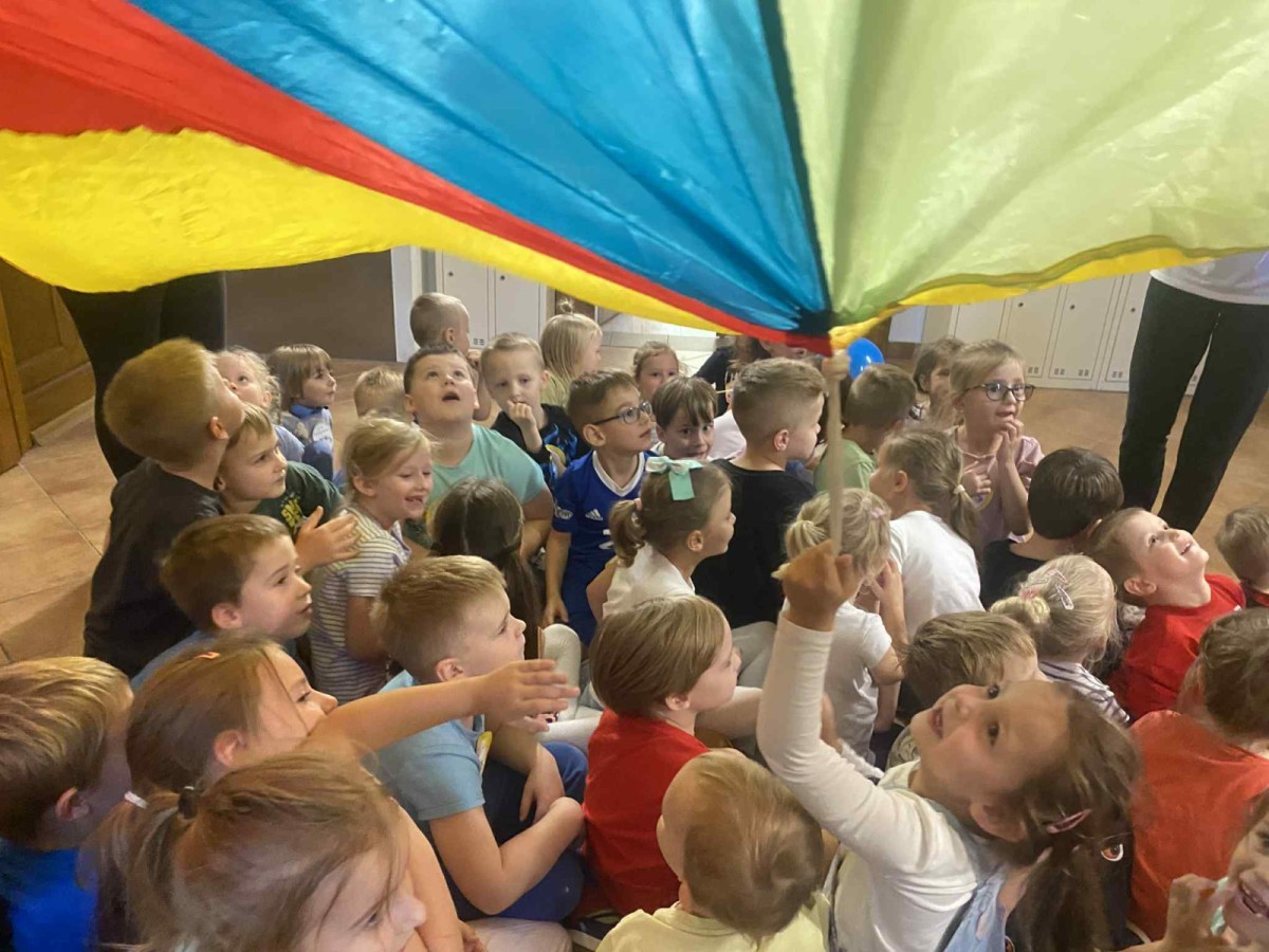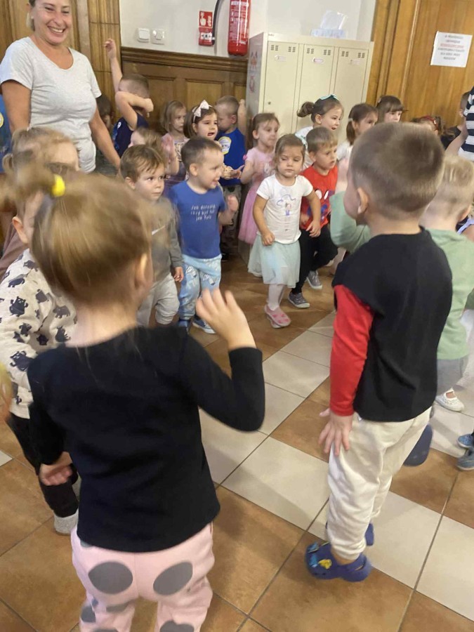 Przedszkolaki uczestniczyły w zabawach ruchowych przy muzyce, tańczyły, śpiewały i brały udział w różnych konkurencjach, które wywoływały mnóstwo uśmiechu i radości. Nie zabrakło również zabawy z chustą animacyjną, kolorowymi piłkami oraz zabaw z gumą, które dostarczyły wszystkim wiele śmiechu i pozytywnej energii.
