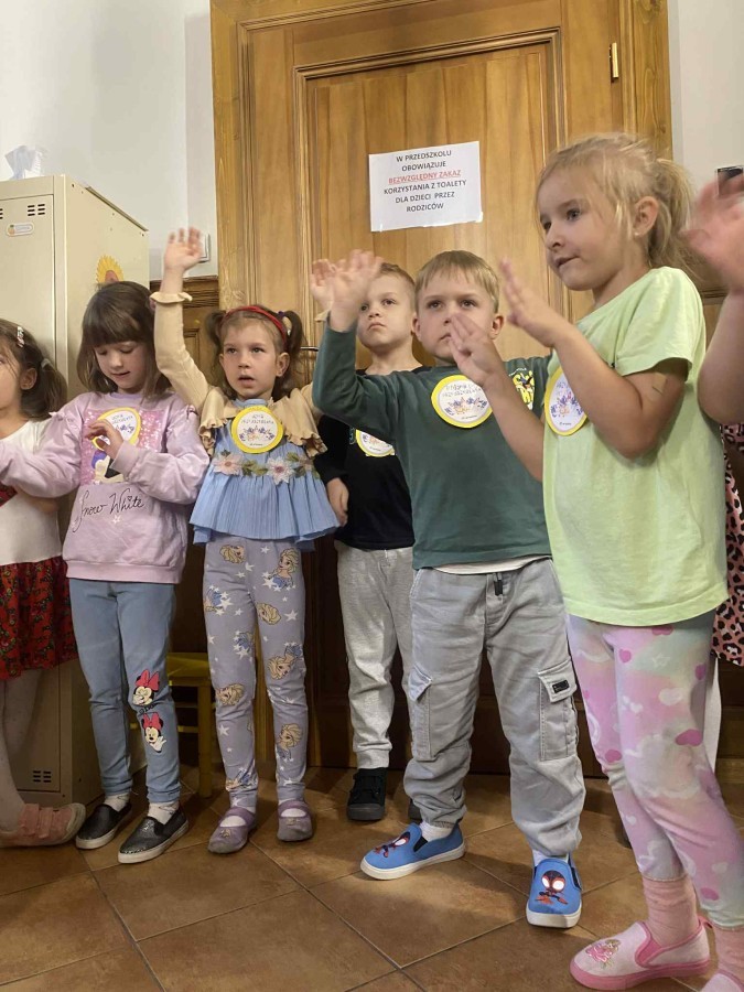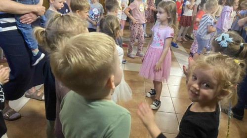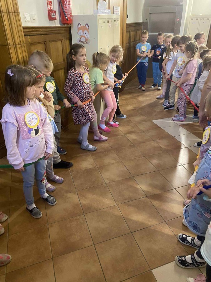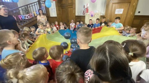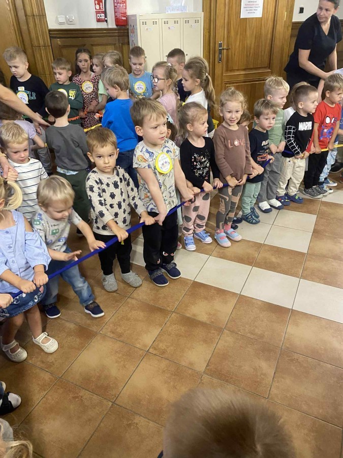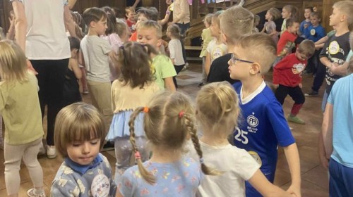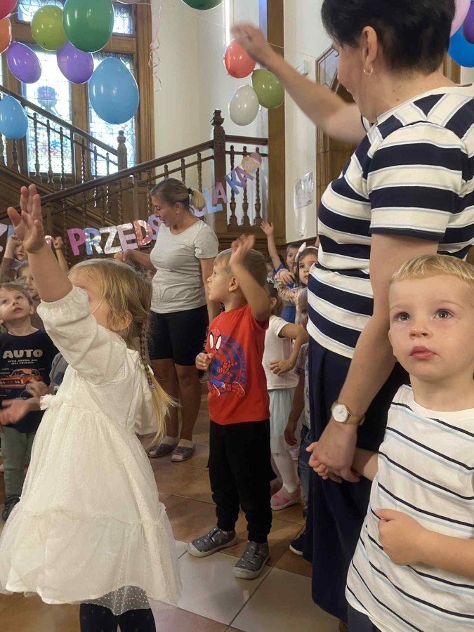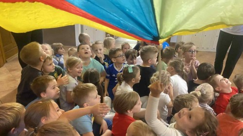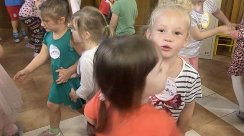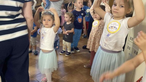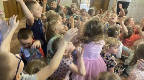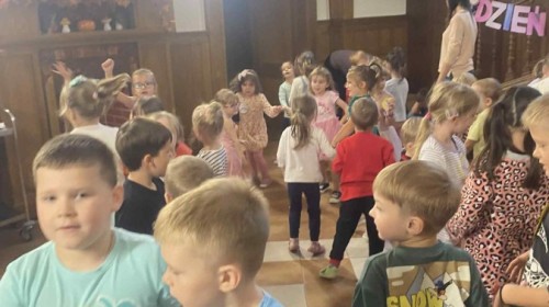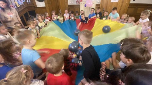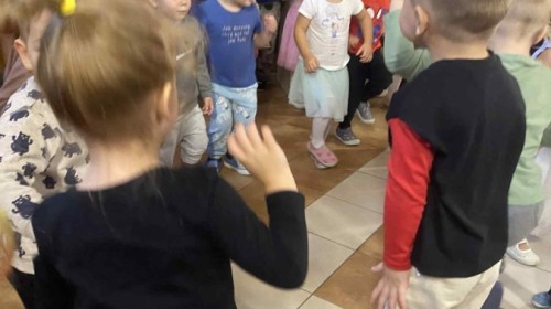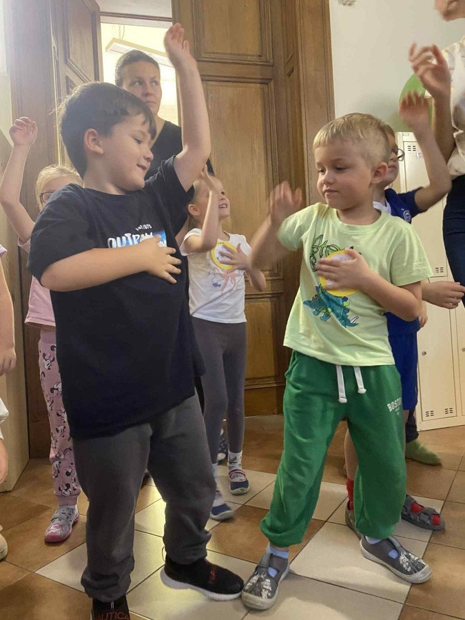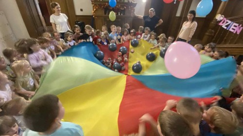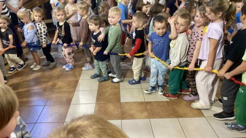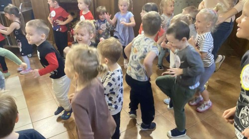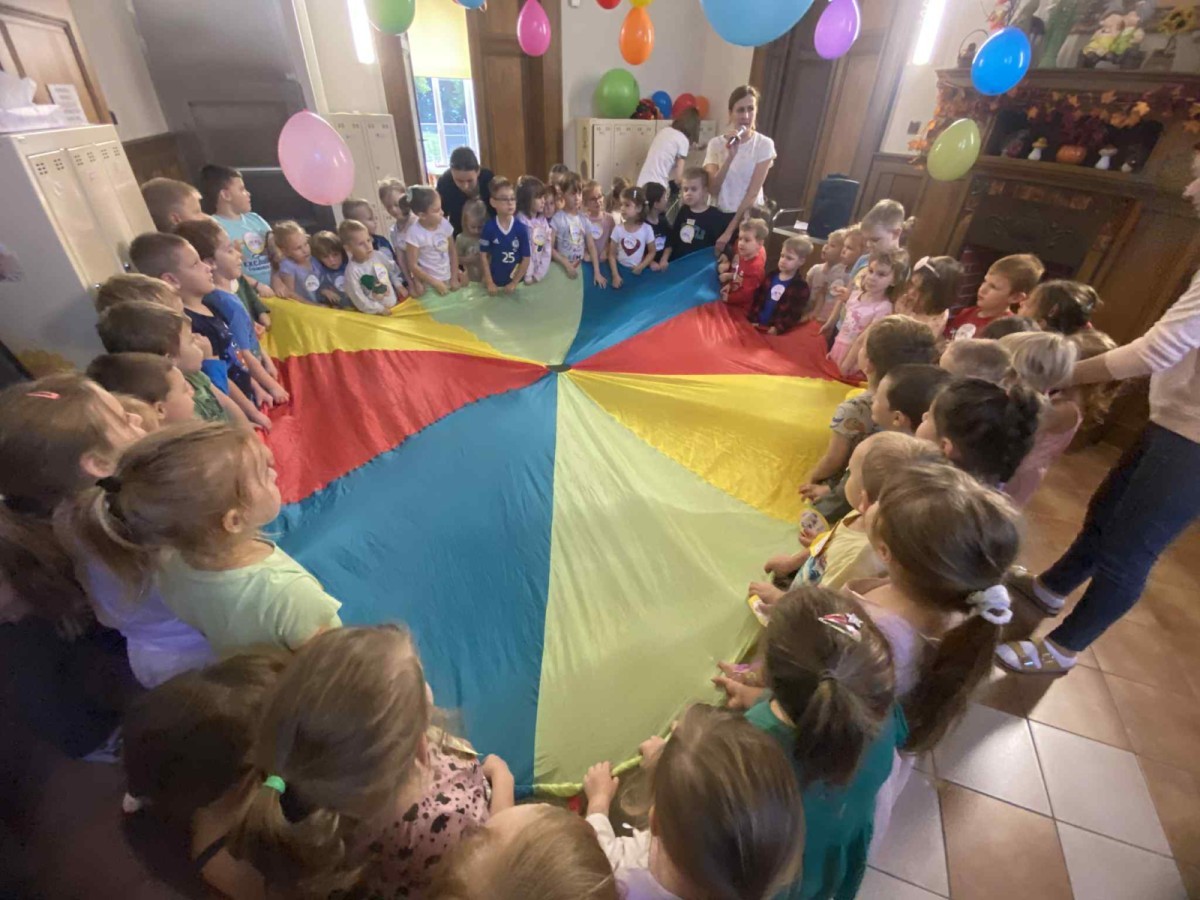 Przedszkolaki uczestniczyły w zabawach ruchowych przy muzyce, tańczyły, śpiewały i brały udział w różnych konkurencjach, które wywoływały mnóstwo uśmiechu i radości. Nie zabrakło również zabawy z chustą animacyjną, kolorowymi piłkami oraz zabaw z gumą, które dostarczyły wszystkim wiele śmiechu i pozytywnej energii.