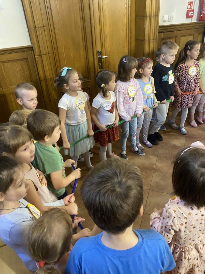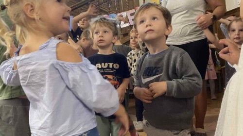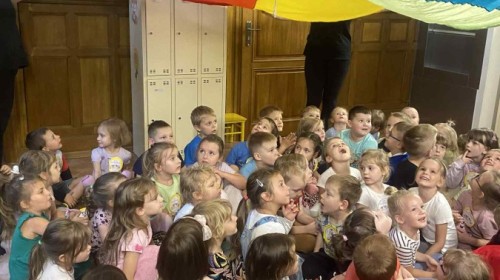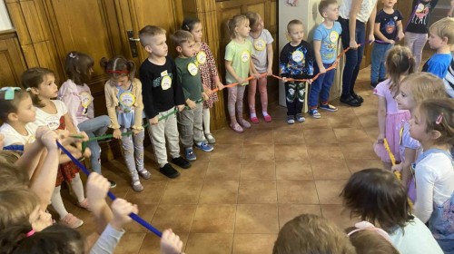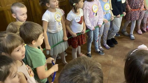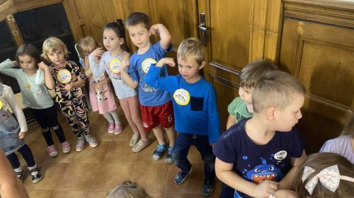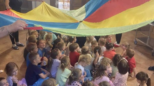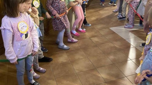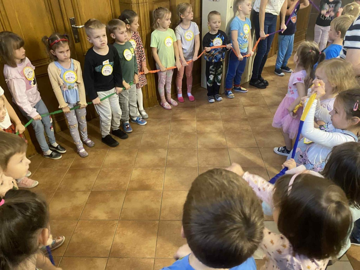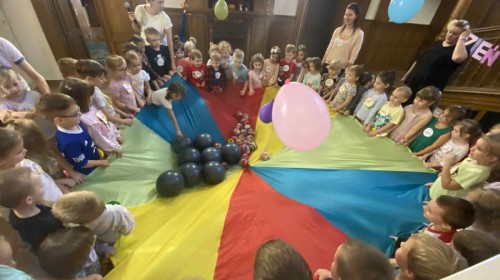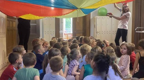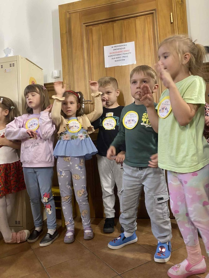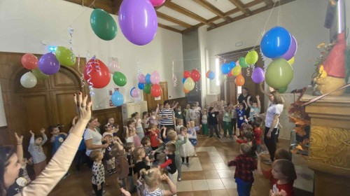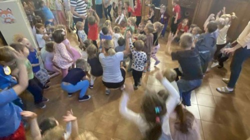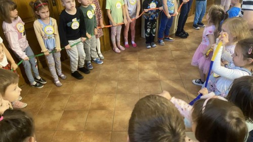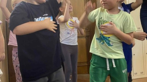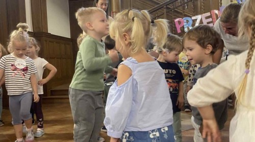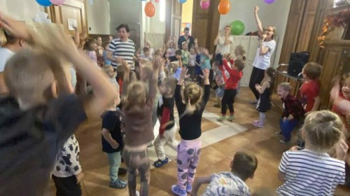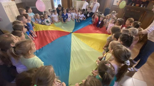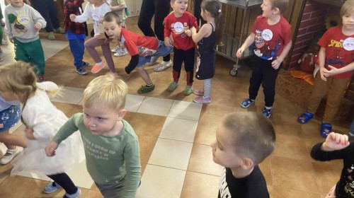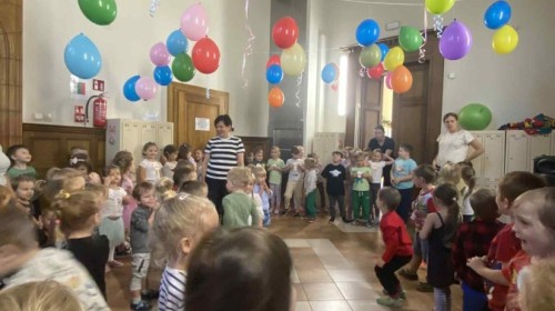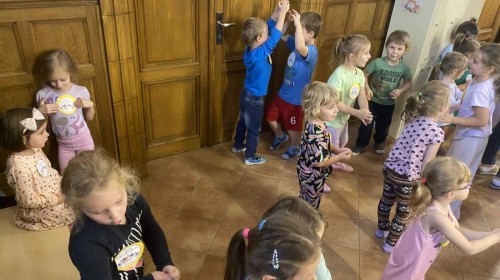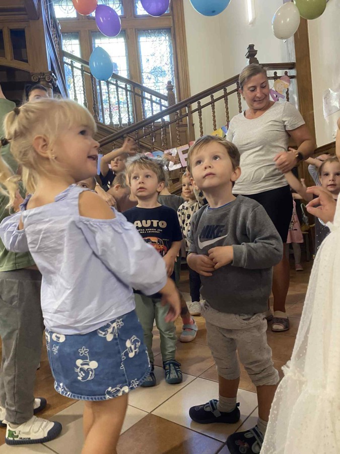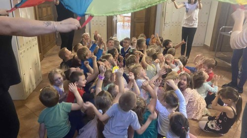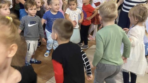 Przedszkolaki uczestniczyły w zabawach ruchowych przy muzyce, tańczyły, śpiewały i brały udział w różnych konkurencjach, które wywoływały mnóstwo uśmiechu i radości. Nie zabrakło również zabawy z chustą animacyjną, kolorowymi piłkami oraz zabaw z gumą, które dostarczyły wszystkim wiele śmiechu i pozytywnej energii.