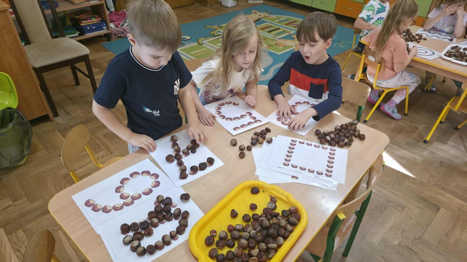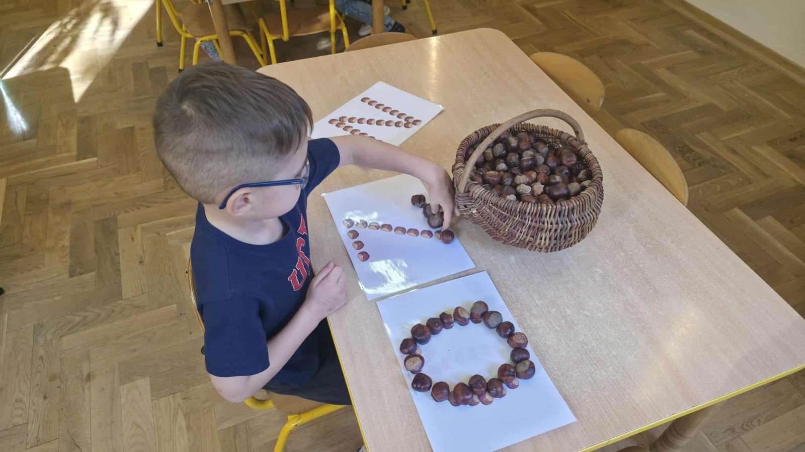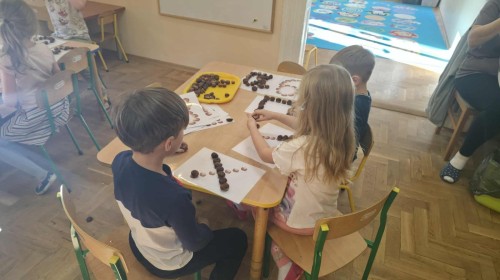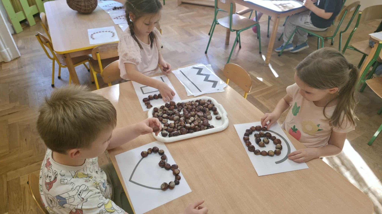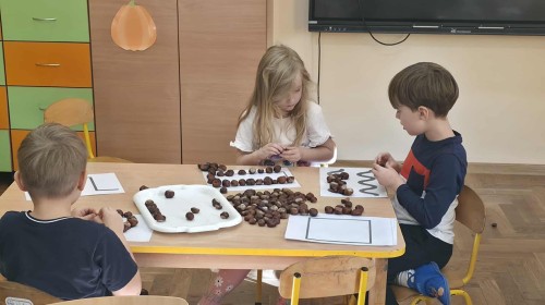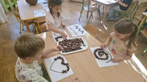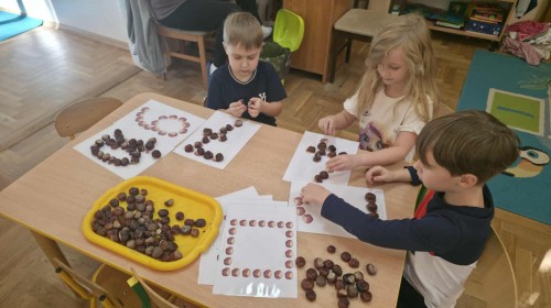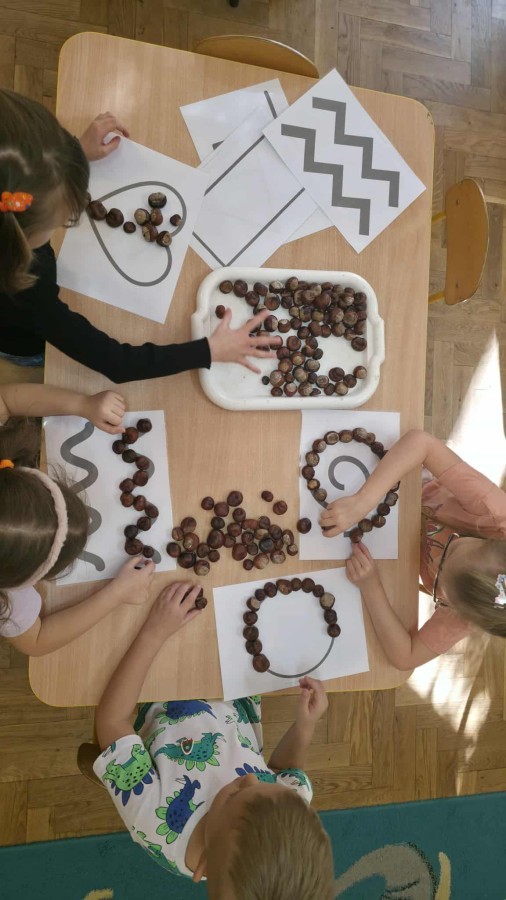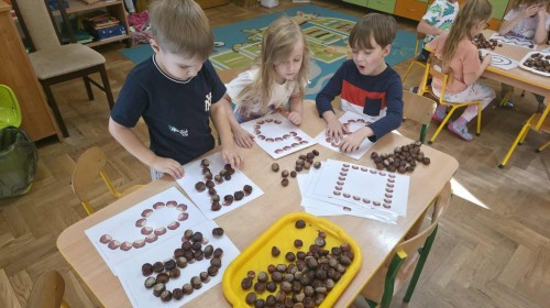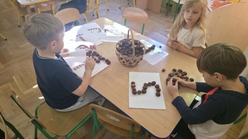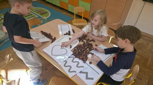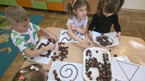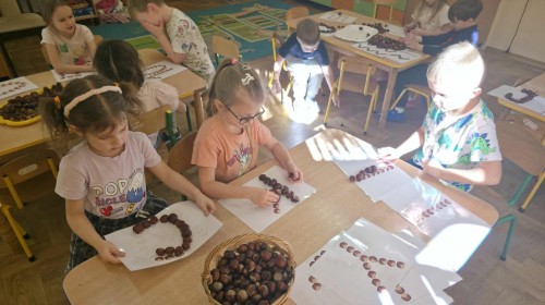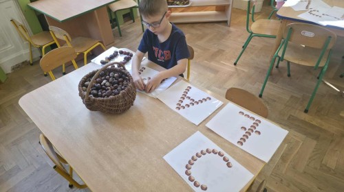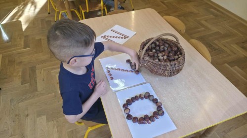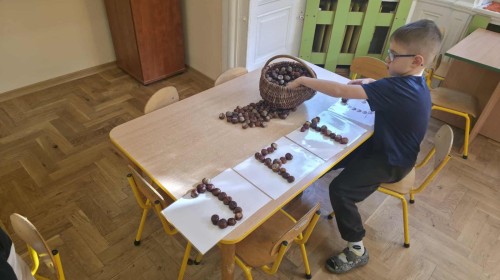 Starszaki z zaangażowaniem układały dzisiaj kasztany, tworząc z nich najróżniejsze wzory – spirale, zygzaki, fale, litery i cyfry. Ta prosta, a jednocześnie niezwykle wartościowa zabawa rozwijała motorykę małą i sprawność palców, przygotowując dzieci do nauki pisania. Układanie kasztanowych wzorów sprzyjało również rozwijaniu myślenia matematycznego – dzieci odkrywały rytmy, powtarzalność i kierunki. Podczas pracy panowała atmosfera skupienia i wyciszenia, a kontakt z naturalnym materiałem dostarczał wielu przyjemnych doznań sensorycznych. To była ciekawa lekcja koncentracji, cierpliwości i kreatywności, a przy okazji doskonała okazja do utrwalenia poznanych liter i cyfr.