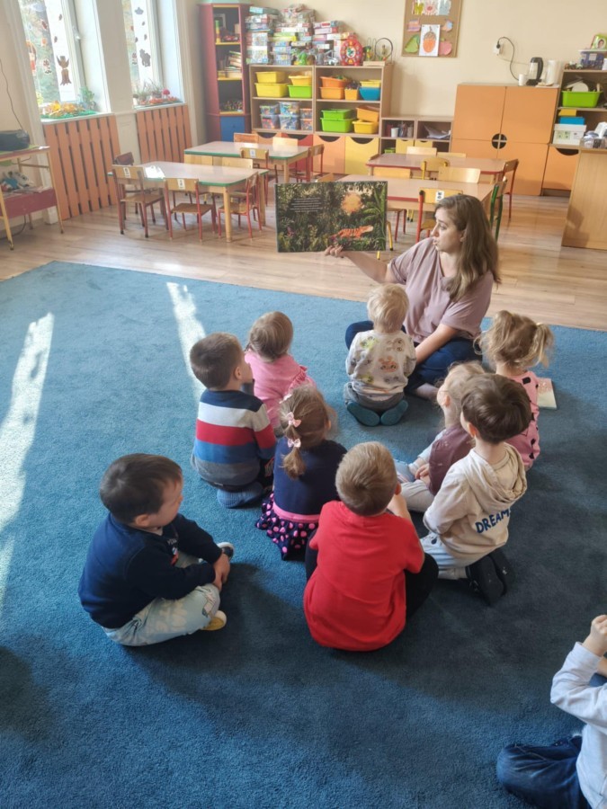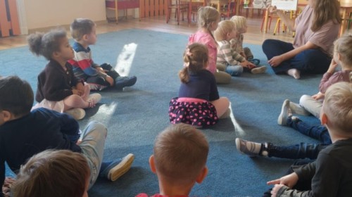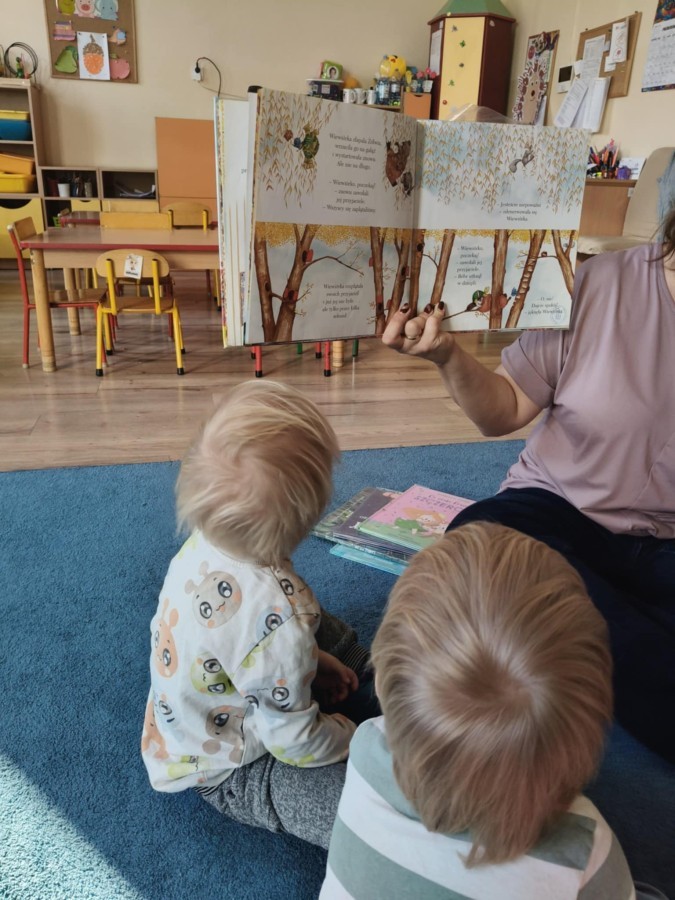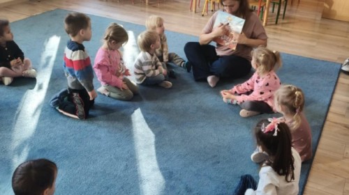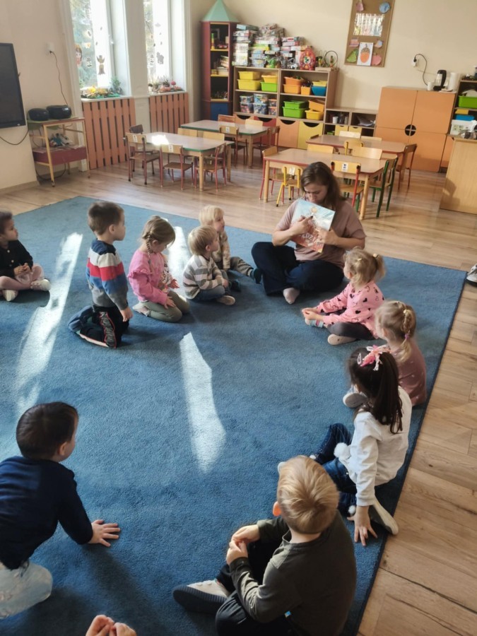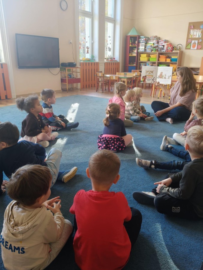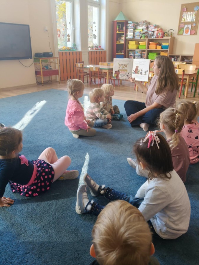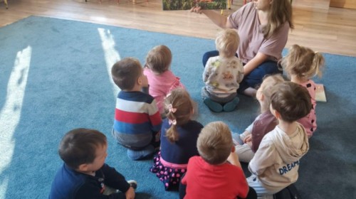 W październiku po raz pierwszy grupę Maluchy odwiedziła Pani Kasia z Dzielnicowej Biblioteki Publicznej. Maluszki z uwagą słuchały czytanych przez nią książeczek. To było ciekawe spotkanie.