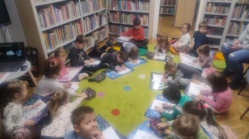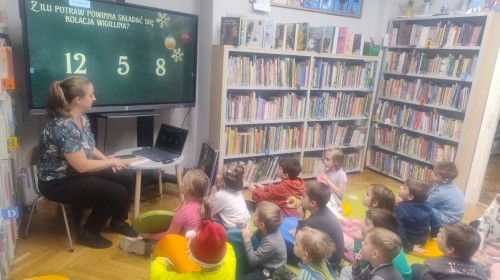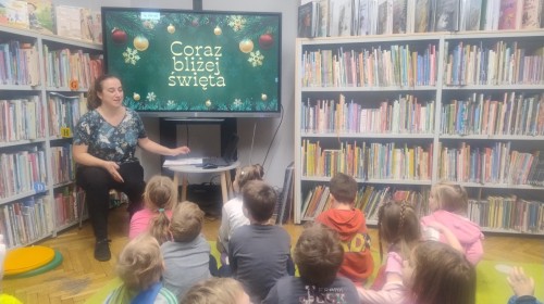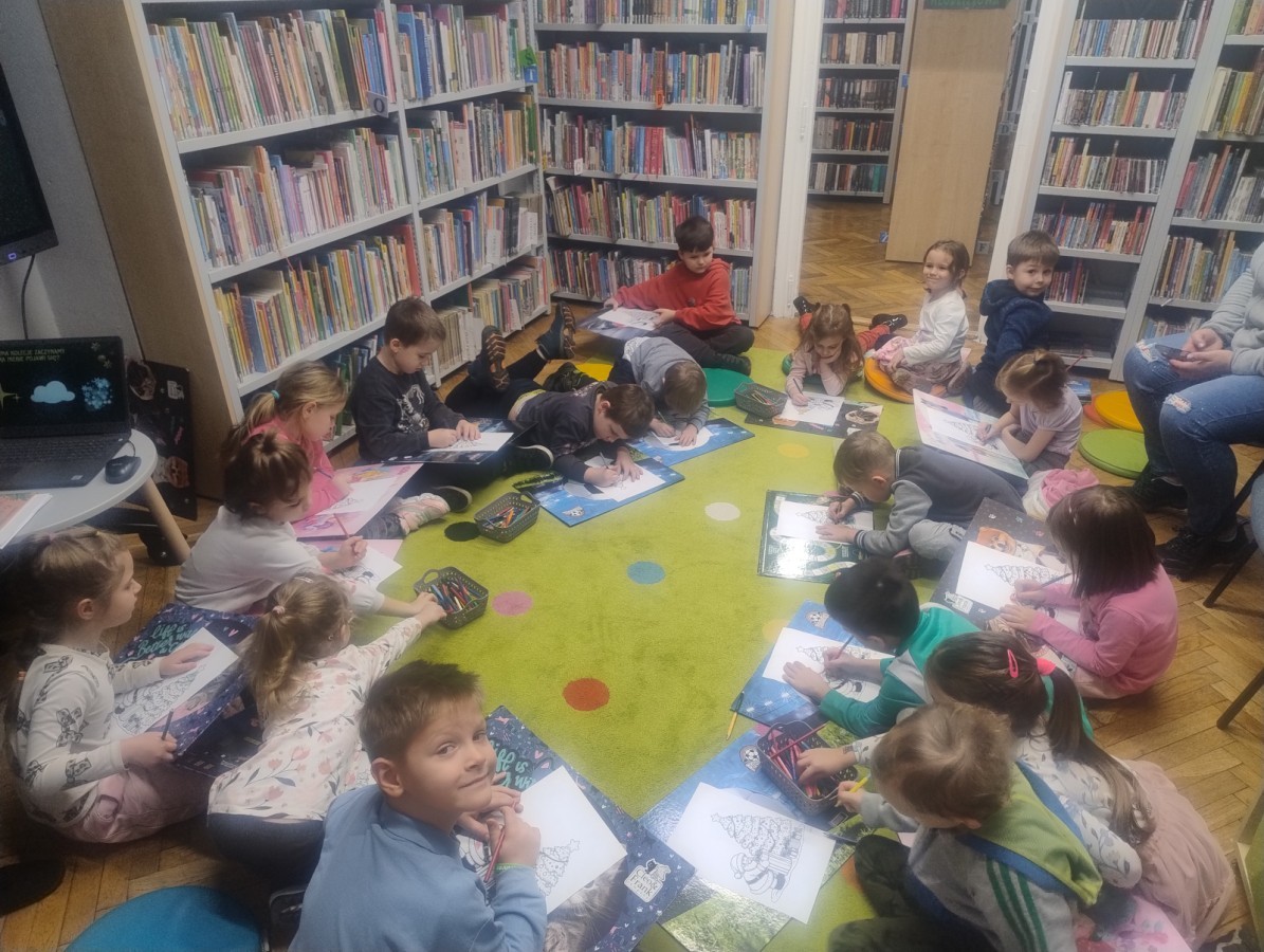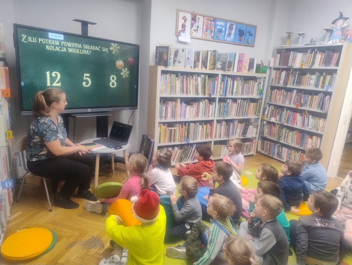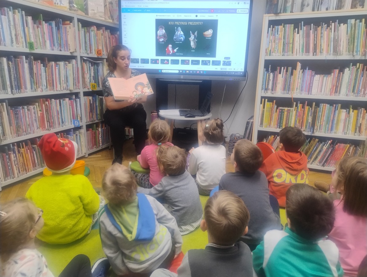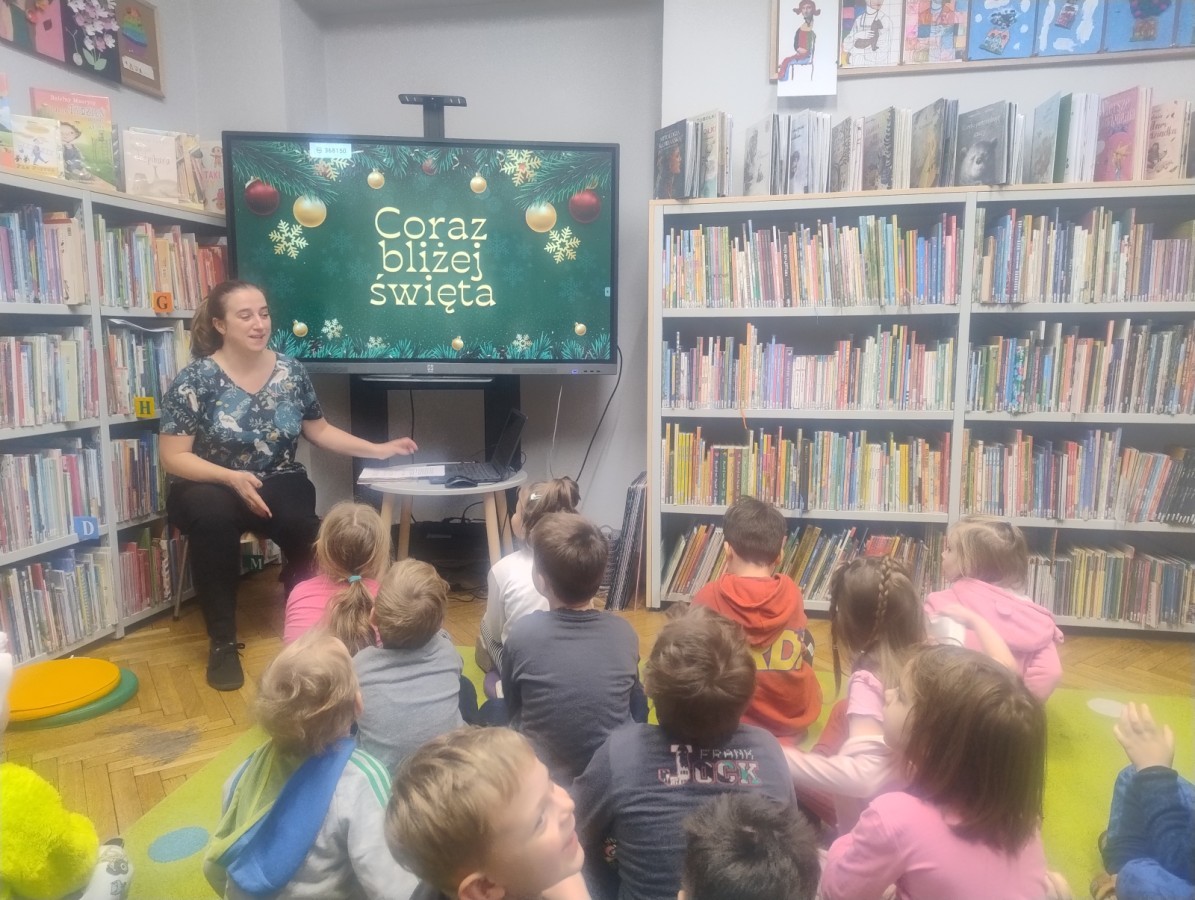 Dzieci odwiedziły Bibliotekę Dzielnicową, gdzie wzięły udział w zajęciach poświęconych tradycjom świątecznym. Podczas spotkania obejrzały ciekawą prezentację multimedialną, dzięki której poznały zwyczaje związane ze świętami. Następnie z zainteresowaniem wysłuchały czytanej książki o tematyce świątecznej. Kolejnym punktem zajęć był quiz, w którym dzieci mogły sprawdzić swoją wiedzę i aktywnie uczestniczyć w zabawie. Na zakończenie dzieci kolorowały świąteczne kolorowanki, rozwijając swoją kreatywność i zdolności plastyczne.