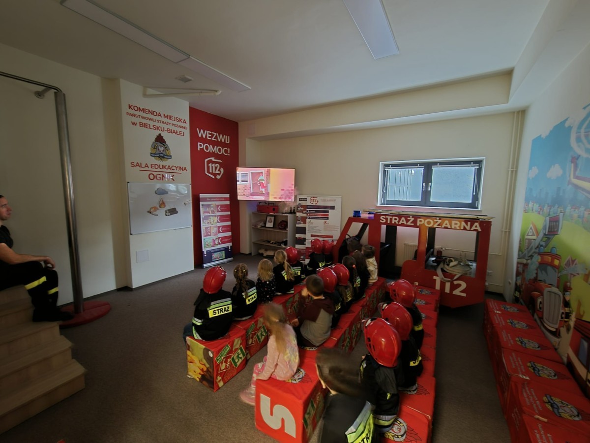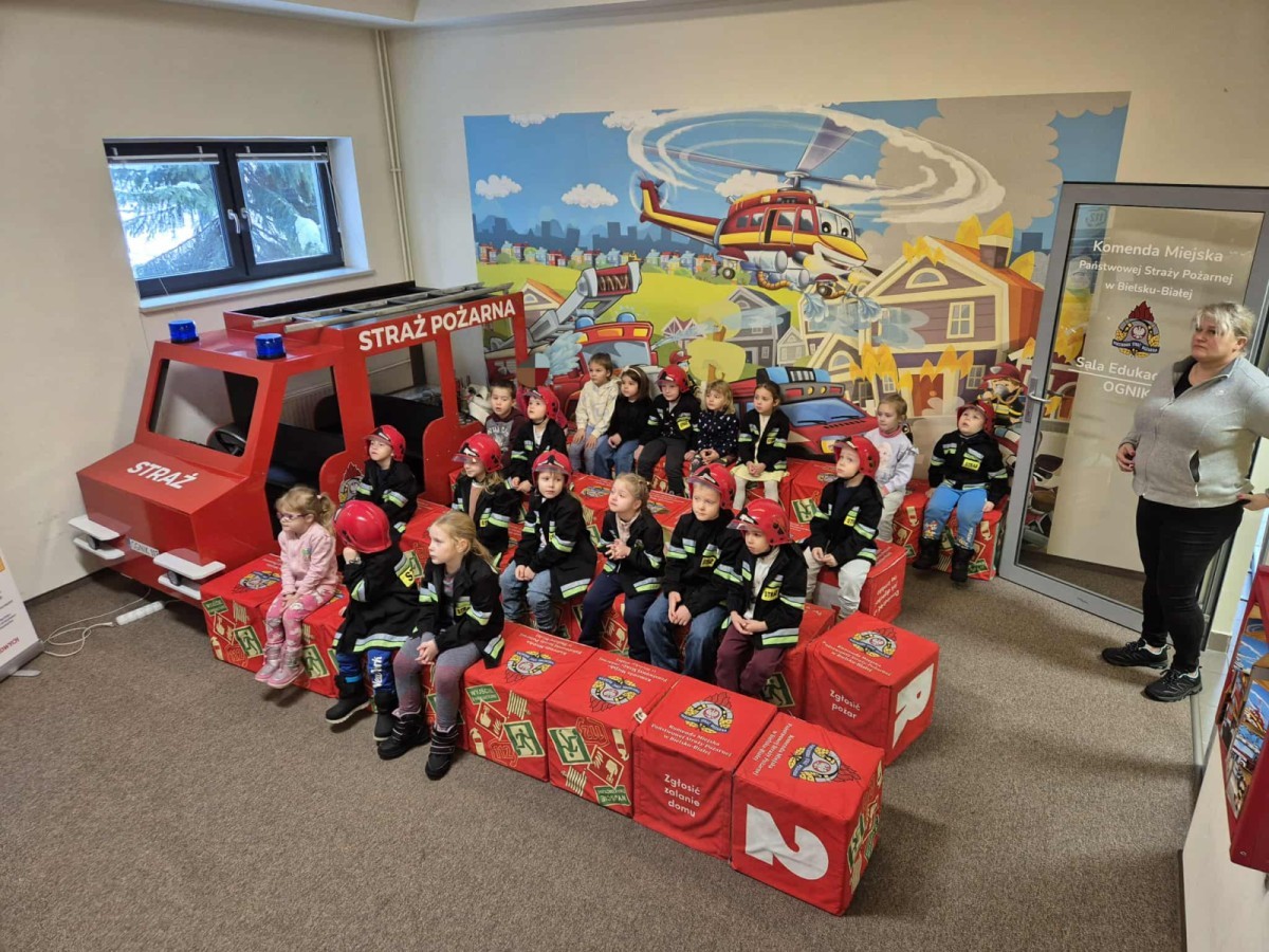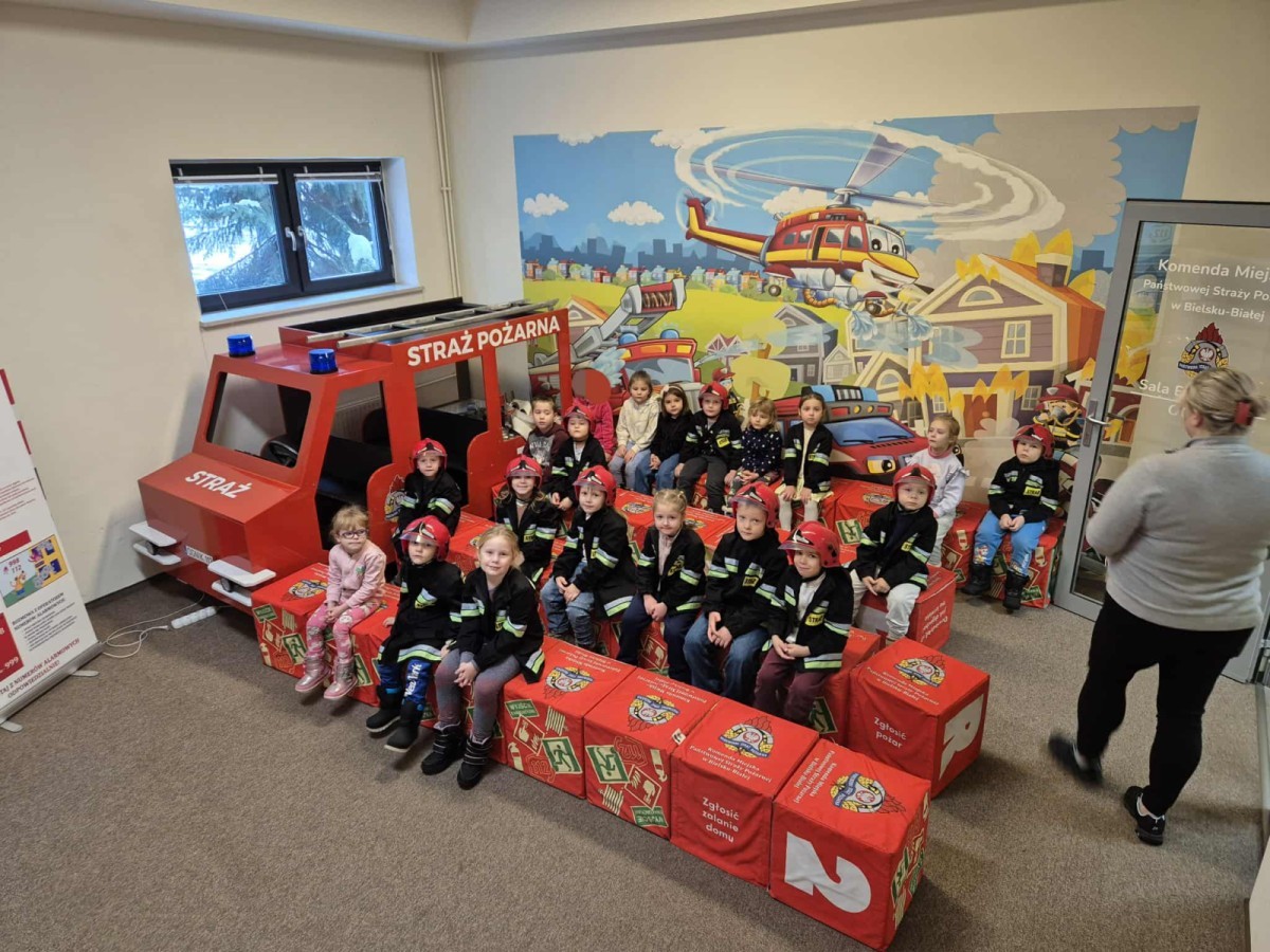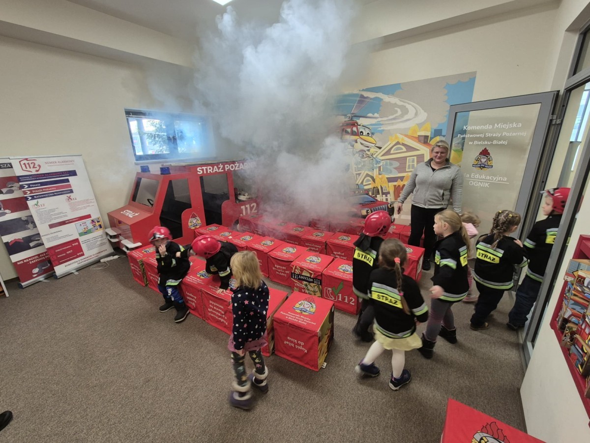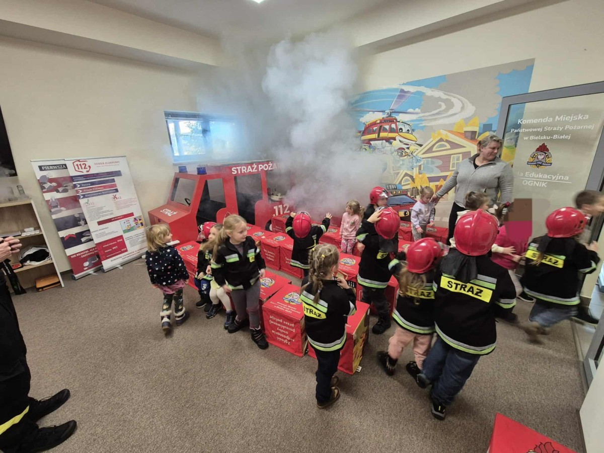 24 listopada grupa Młodsze Starszaki wybrała się do Komendy Miejskiej Państwowej Straży Pożarnej w Bielsku-Białej do sali edukacyjnej "Ognik". Na wstępie dzieci zostały zapoznane z codzienną musztrą strażacką, następnie uczestnicząc w zajęciach dowiedziały się na czym polega praca strażaków zawodowych, jak unikać zagrożeń oraz w jaki sposób powiadamiać służby o wypadku czy pożarze. Przeprowadzono także symulację sytuacji zadymienia, w której dzieci bezpiecznie musiały opuścić zadymione pomieszczenie. Na koniec wszyscy udaliśmy się do garaży, gdzie obejrzeliśmy samochody gaśnicze, ponton, quada oraz inne pojazdy służące strażakom do codziennej pracy. Składamy serdeczne podziękowania dla Pana Szymona za oprowadzenie nas po jednostce oraz przybliżenie w ciekawy sposób tajników swojej pracy.