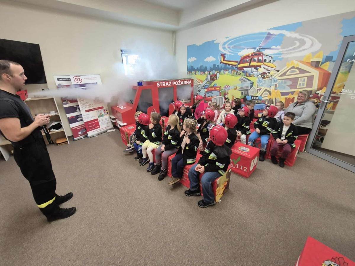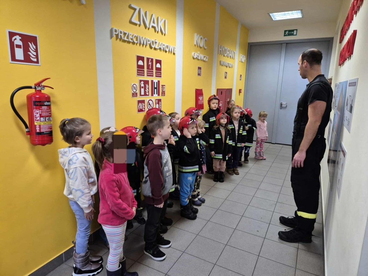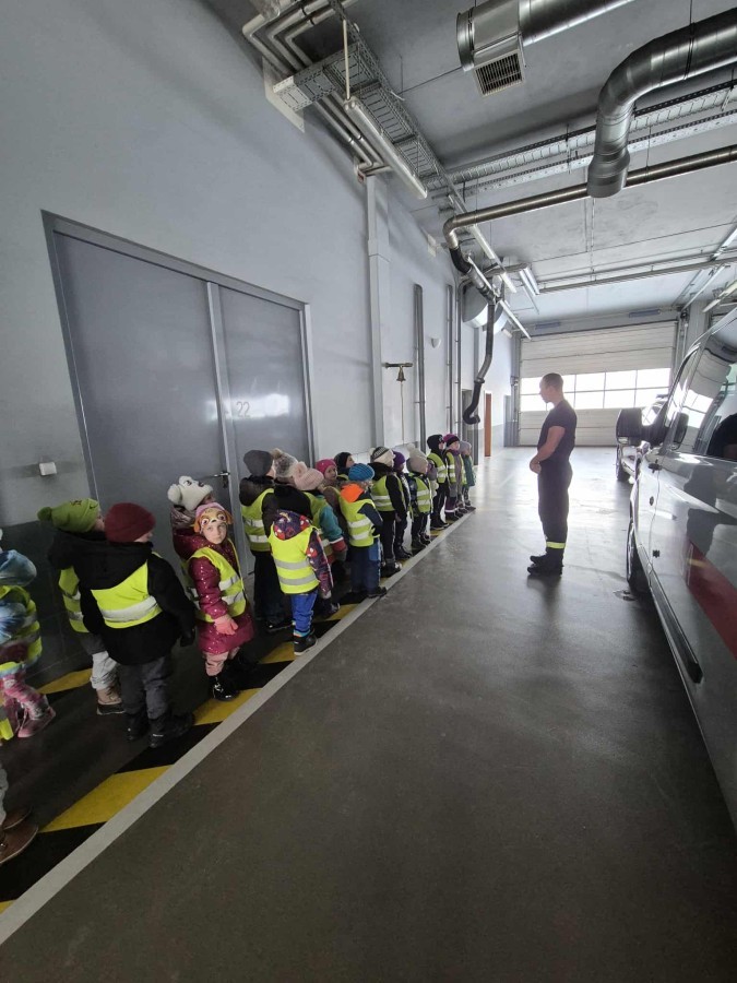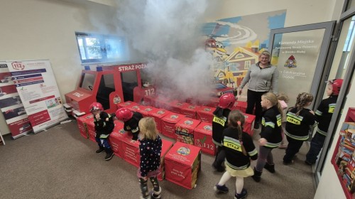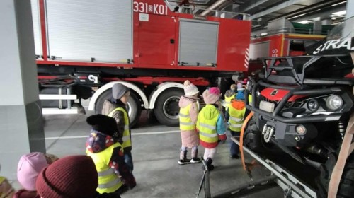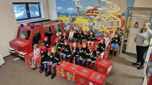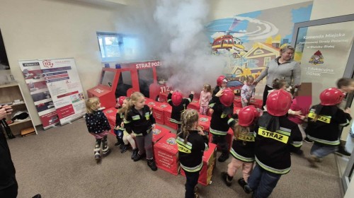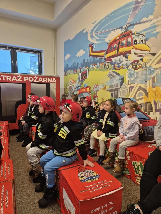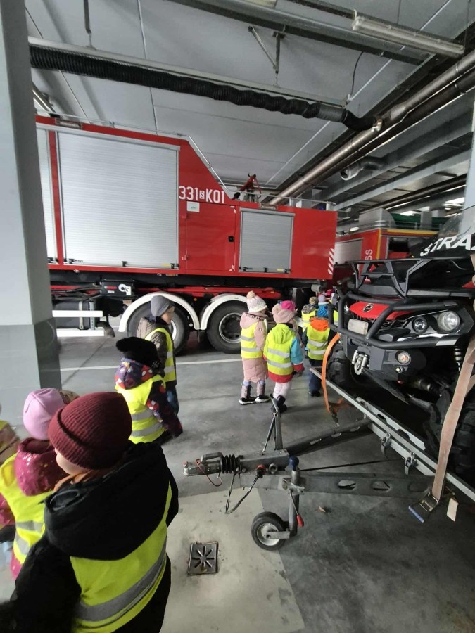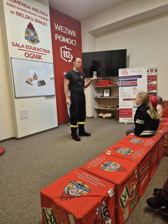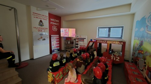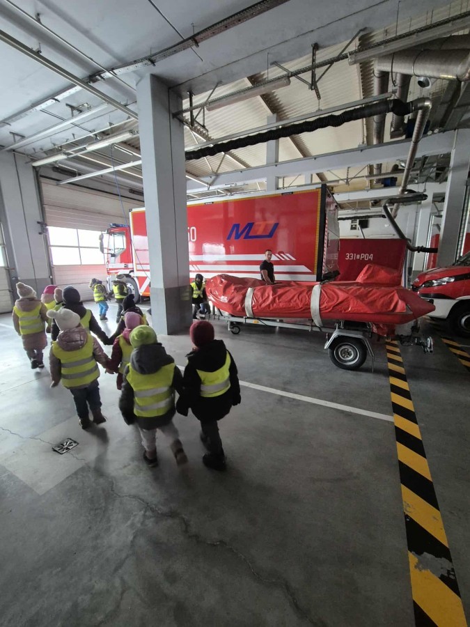 24 listopada grupa Młodsze Starszaki wybrała się do Komendy Miejskiej Państwowej Straży Pożarnej w Bielsku-Białej do sali edukacyjnej "Ognik". Na wstępie dzieci zostały zapoznane z codzienną musztrą strażacką, następnie uczestnicząc w zajęciach dowiedziały się na czym polega praca strażaków zawodowych, jak unikać zagrożeń oraz w jaki sposób powiadamiać służby o wypadku czy pożarze. Przeprowadzono także symulację sytuacji zadymienia, w której dzieci bezpiecznie musiały opuścić zadymione pomieszczenie. Na koniec wszyscy udaliśmy się do garaży, gdzie obejrzeliśmy samochody gaśnicze, ponton, quada oraz inne pojazdy służące strażakom do codziennej pracy. Składamy serdeczne podziękowania dla Pana Szymona za oprowadzenie nas po jednostce oraz przybliżenie w ciekawy sposób tajników swojej pracy.