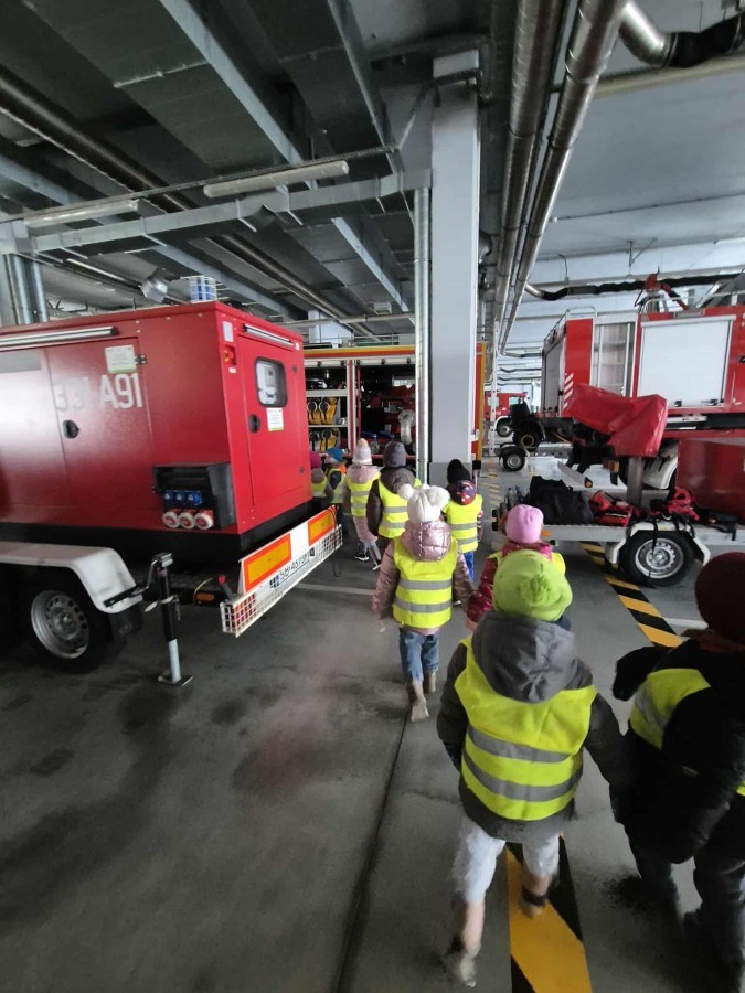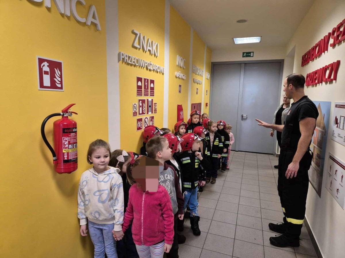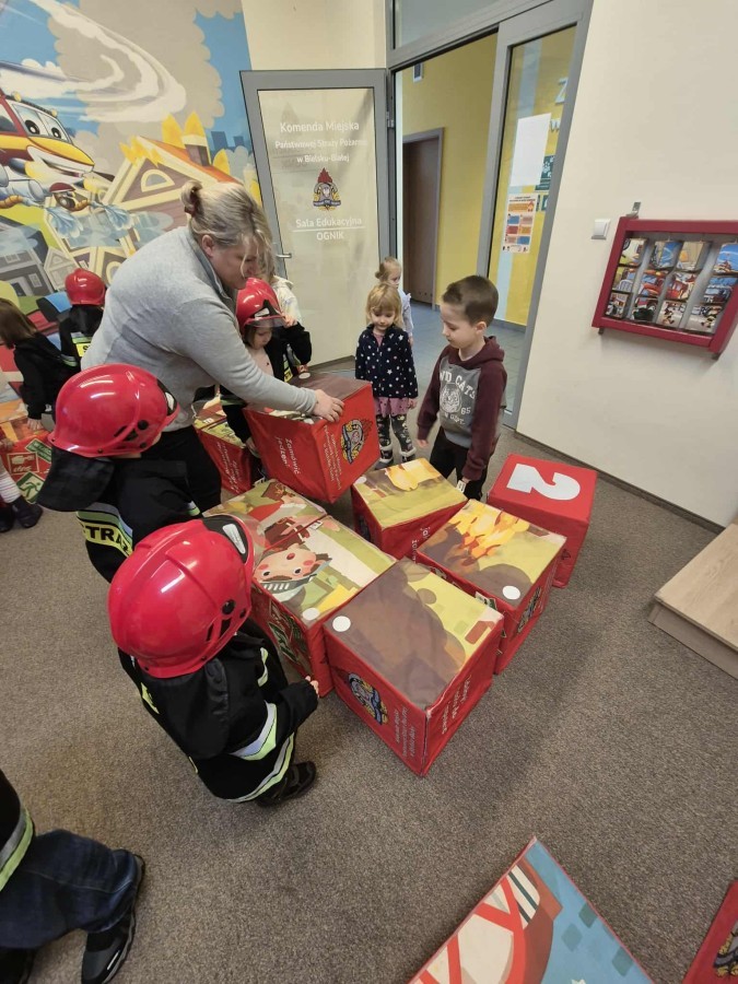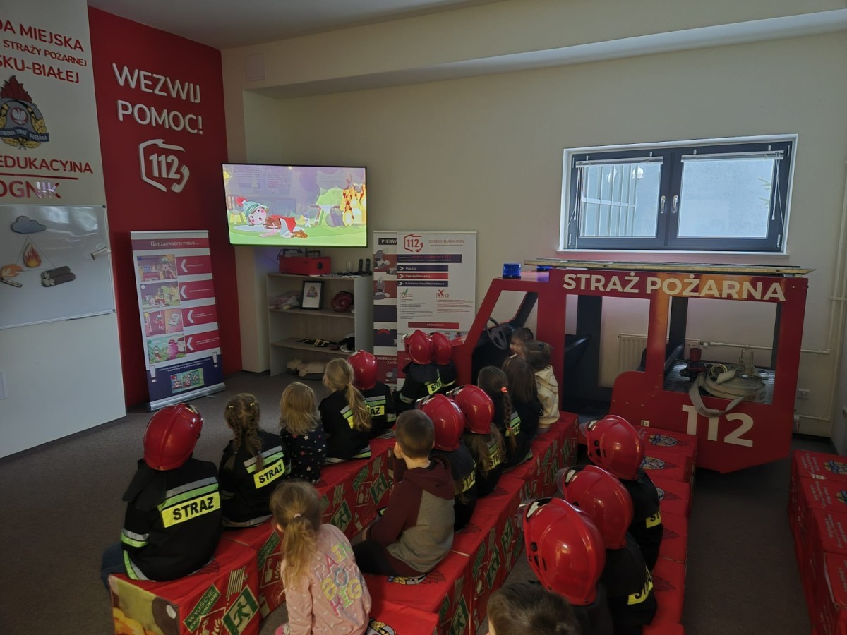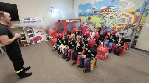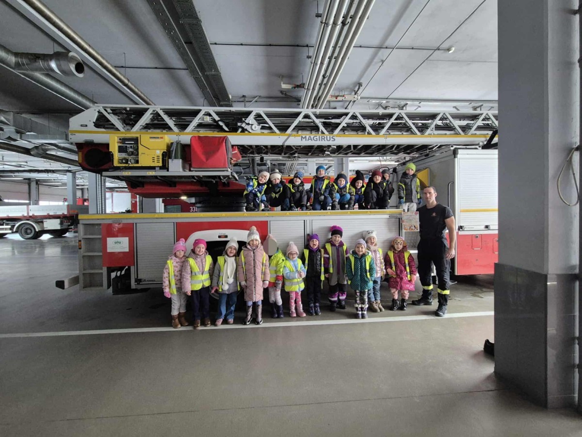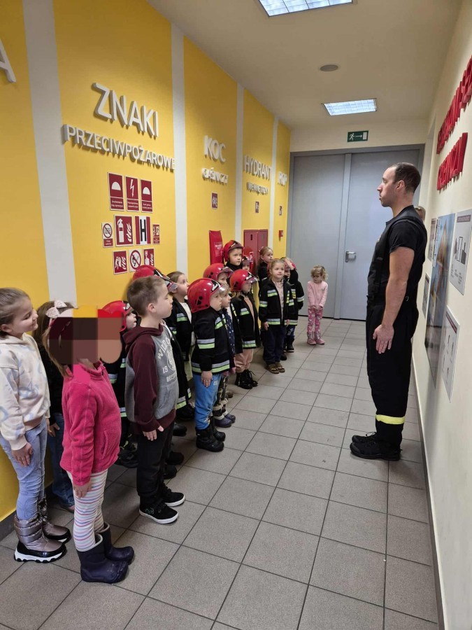 24 listopada grupa Młodsze Starszaki wybrała się do Komendy Miejskiej Państwowej Straży Pożarnej w Bielsku-Białej do sali edukacyjnej "Ognik". Na wstępie dzieci zostały zapoznane z codzienną musztrą strażacką, następnie uczestnicząc w zajęciach dowiedziały się na czym polega praca strażaków zawodowych, jak unikać zagrożeń oraz w jaki sposób powiadamiać służby o wypadku czy pożarze. Przeprowadzono także symulację sytuacji zadymienia, w której dzieci bezpiecznie musiały opuścić zadymione pomieszczenie. Na koniec wszyscy udaliśmy się do garaży, gdzie obejrzeliśmy samochody gaśnicze, ponton, quada oraz inne pojazdy służące strażakom do codziennej pracy. Składamy serdeczne podziękowania dla Pana Szymona za oprowadzenie nas po jednostce oraz przybliżenie w ciekawy sposób tajników swojej pracy.