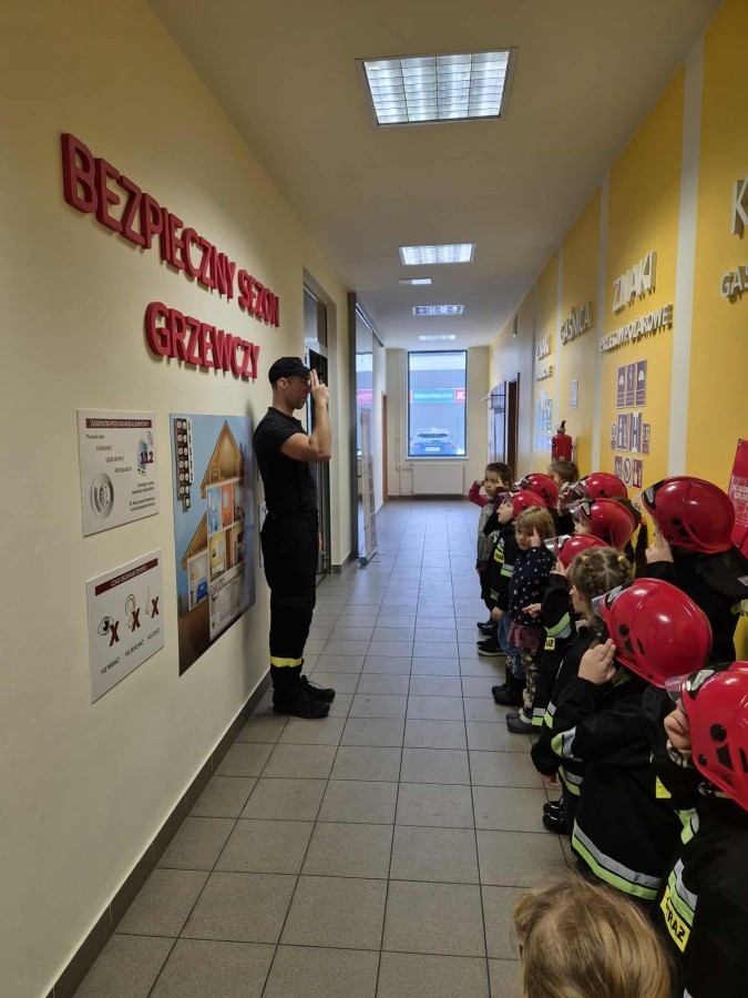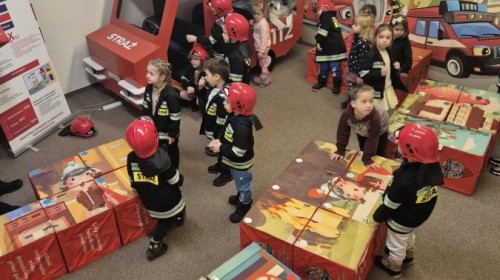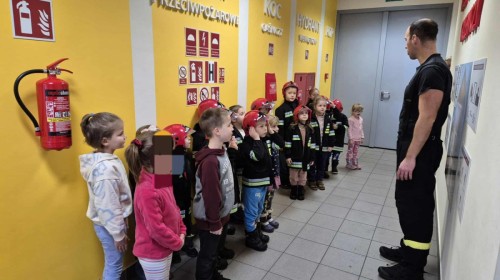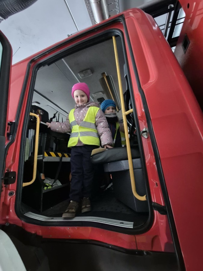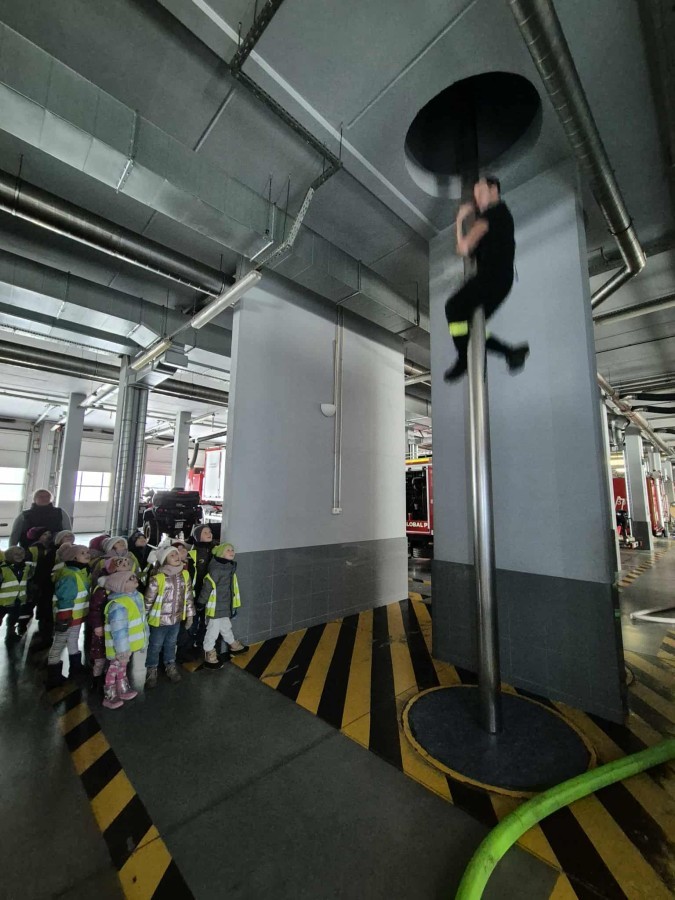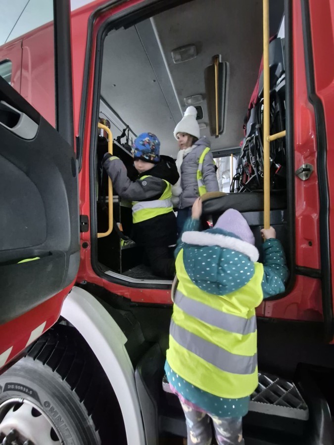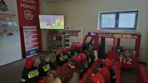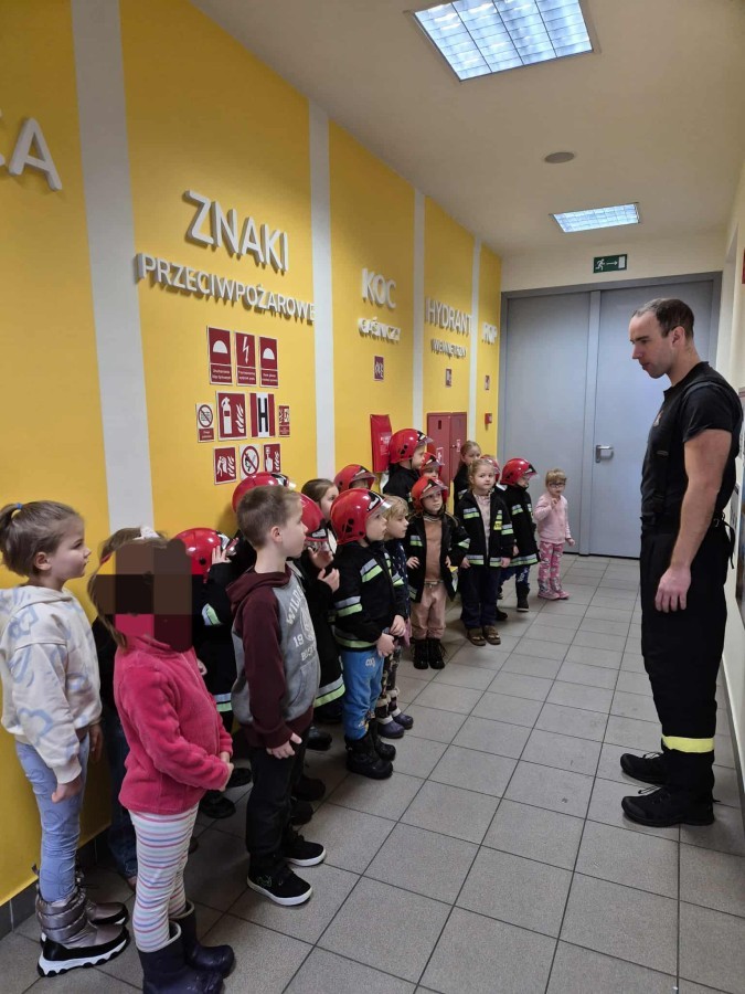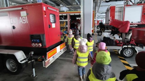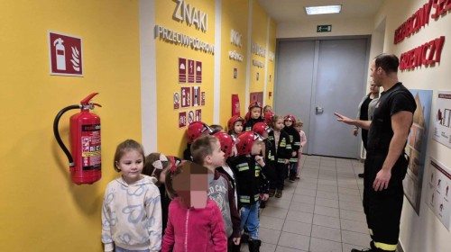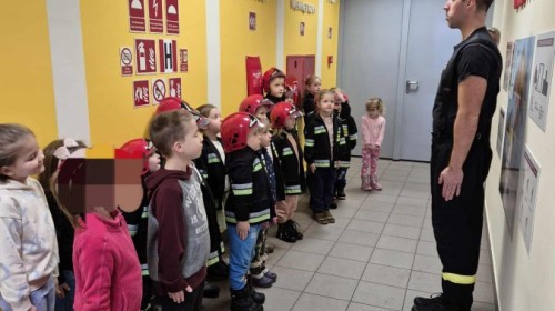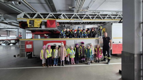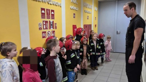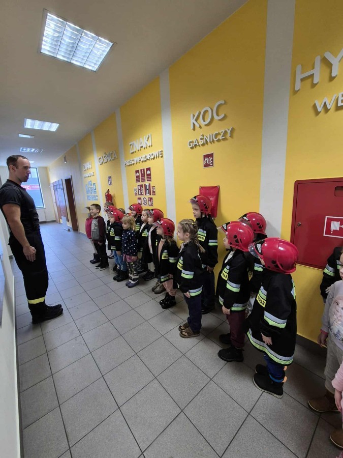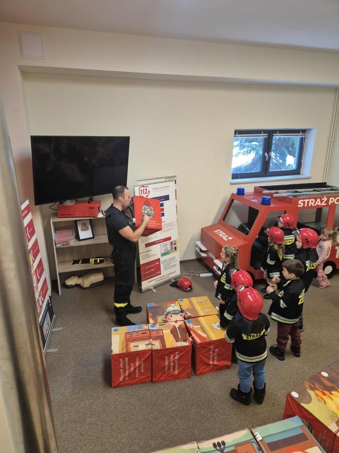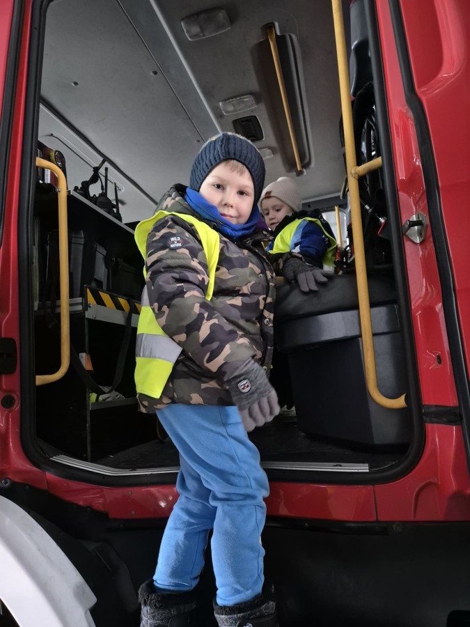24 listopada grupa Młodsze Starszaki wybrała się do Komendy Miejskiej Państwowej Straży Pożarnej w Bielsku-Białej do sali edukacyjnej "Ognik". Na wstępie dzieci zostały zapoznane z codzienną musztrą strażacką, następnie uczestnicząc w zajęciach dowiedziały się na czym polega praca strażaków zawodowych, jak unikać zagrożeń oraz w jaki sposób powiadamiać służby o wypadku czy pożarze. Przeprowadzono także symulację sytuacji zadymienia, w której dzieci bezpiecznie musiały opuścić zadymione pomieszczenie. Na koniec wszyscy udaliśmy się do garaży, gdzie obejrzeliśmy samochody gaśnicze, ponton, quada oraz inne pojazdy służące strażakom do codziennej pracy. Składamy serdeczne podziękowania dla Pana Szymona za oprowadzenie nas po jednostce oraz przybliżenie w ciekawy sposób tajników swojej pracy.
