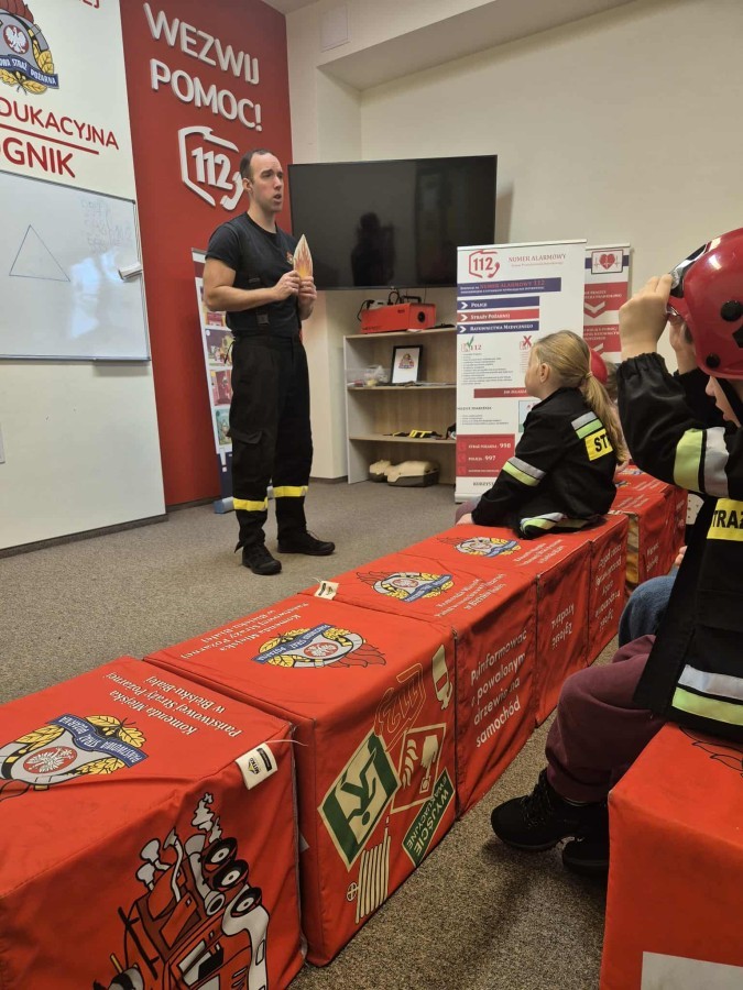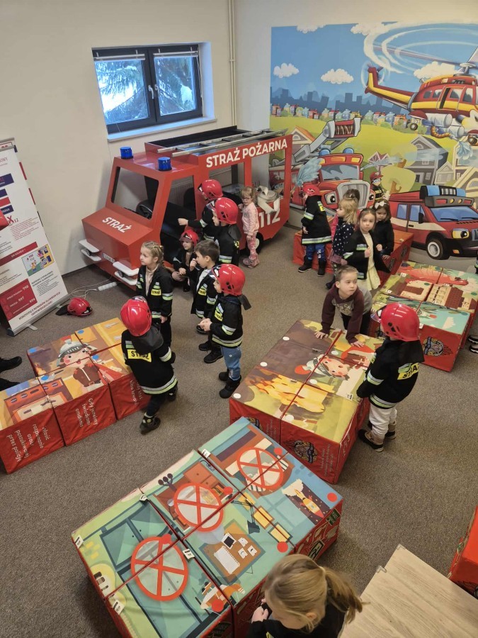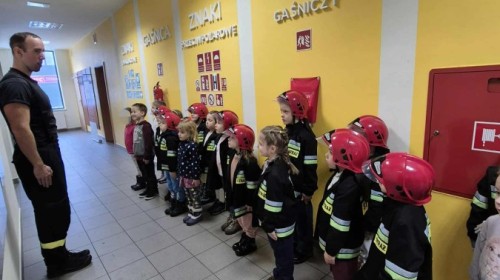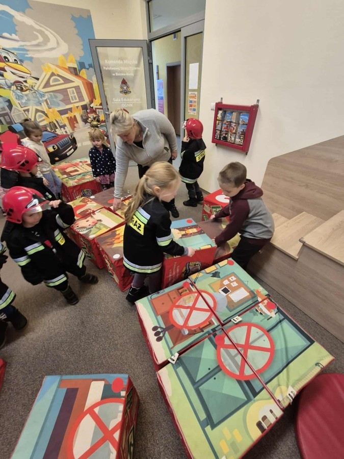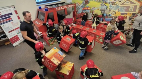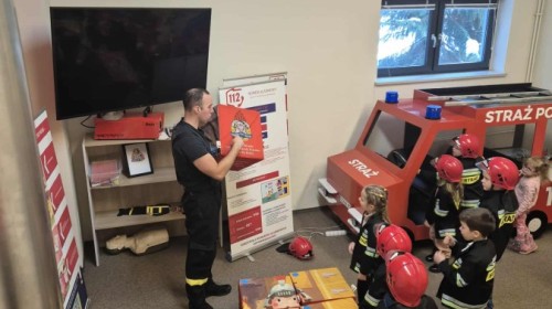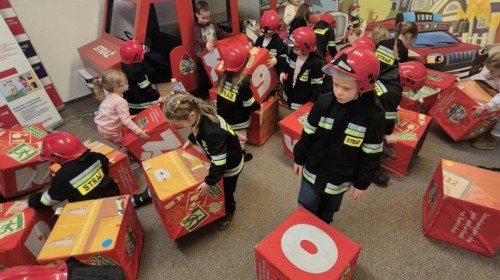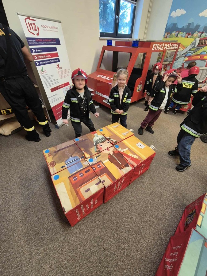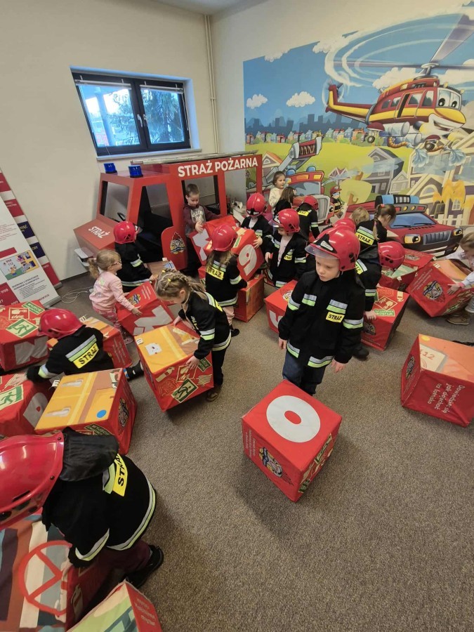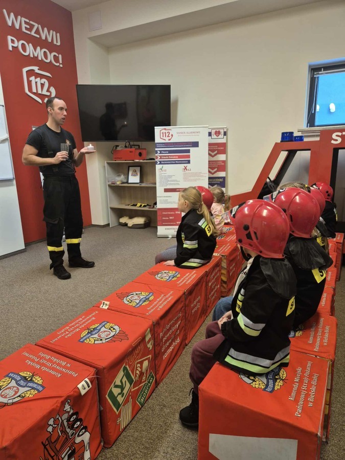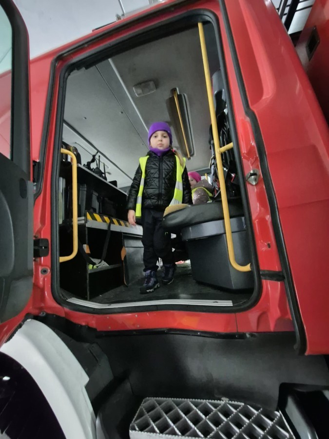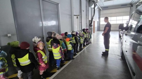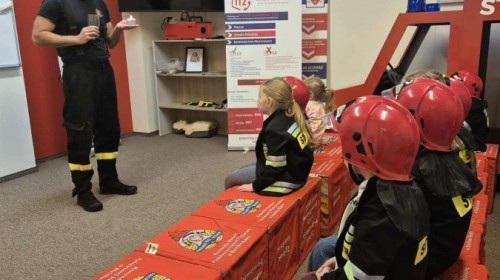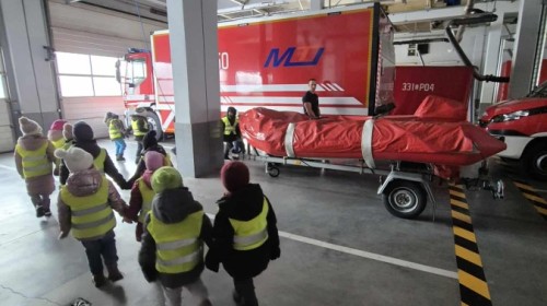 24 listopada grupa Młodsze Starszaki wybrała się do Komendy Miejskiej Państwowej Straży Pożarnej w Bielsku-Białej do sali edukacyjnej "Ognik". Na wstępie dzieci zostały zapoznane z codzienną musztrą strażacką, następnie uczestnicząc w zajęciach dowiedziały się na czym polega praca strażaków zawodowych, jak unikać zagrożeń oraz w jaki sposób powiadamiać służby o wypadku czy pożarze. Przeprowadzono także symulację sytuacji zadymienia, w której dzieci bezpiecznie musiały opuścić zadymione pomieszczenie. Na koniec wszyscy udaliśmy się do garaży, gdzie obejrzeliśmy samochody gaśnicze, ponton, quada oraz inne pojazdy służące strażakom do codziennej pracy. Składamy serdeczne podziękowania dla Pana Szymona za oprowadzenie nas po jednostce oraz przybliżenie w ciekawy sposób tajników swojej pracy.